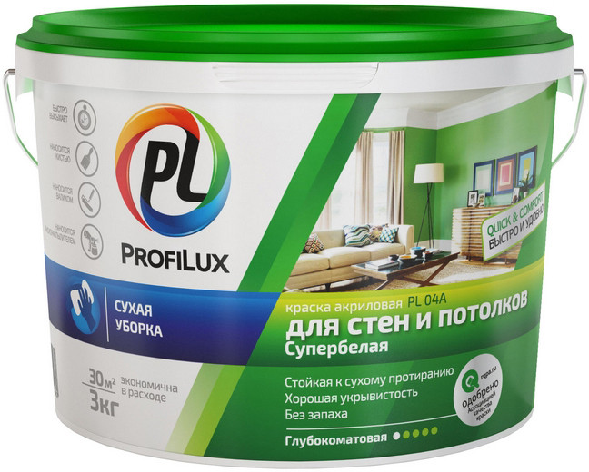 Купить Краска акриловая Profilux PL-04А для стен и потолка глубокоматовая белая 3 кг по лучшей цене с доставкой - интернет магазин №1 в России