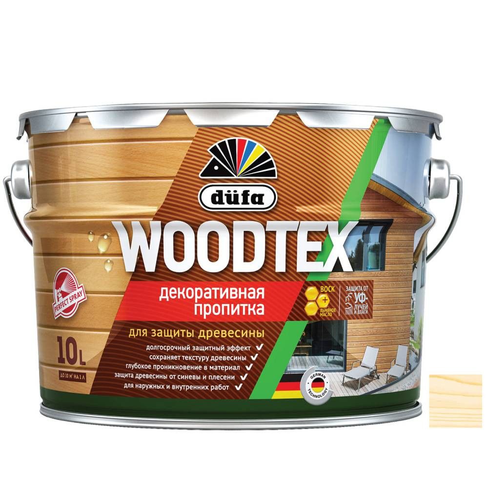 Купить Пропитка декоративная для защиты древесины Dufa Woodtex бесцветная 9 л по лучшей цене с доставкой - интернет магазин №1 в России