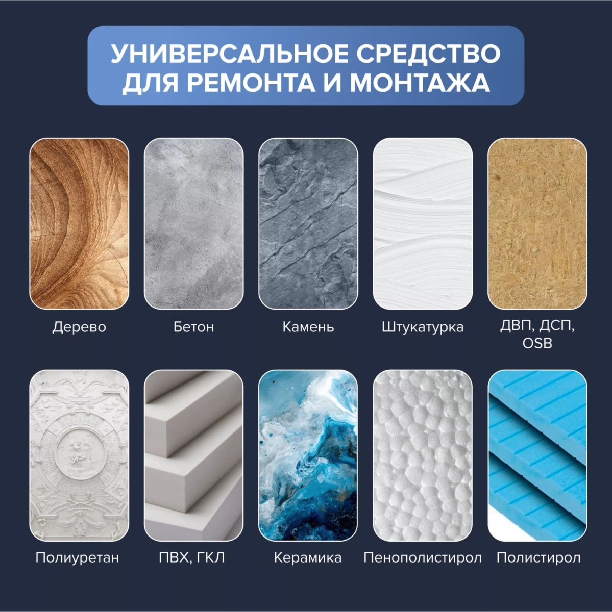Бетон, Гипсокартон, ДВП, ДСП, Дерево, Камень, Керамика, ОСП, ПВХ, Пенопласт, Полистирол, Полиуретан, Штукатурка