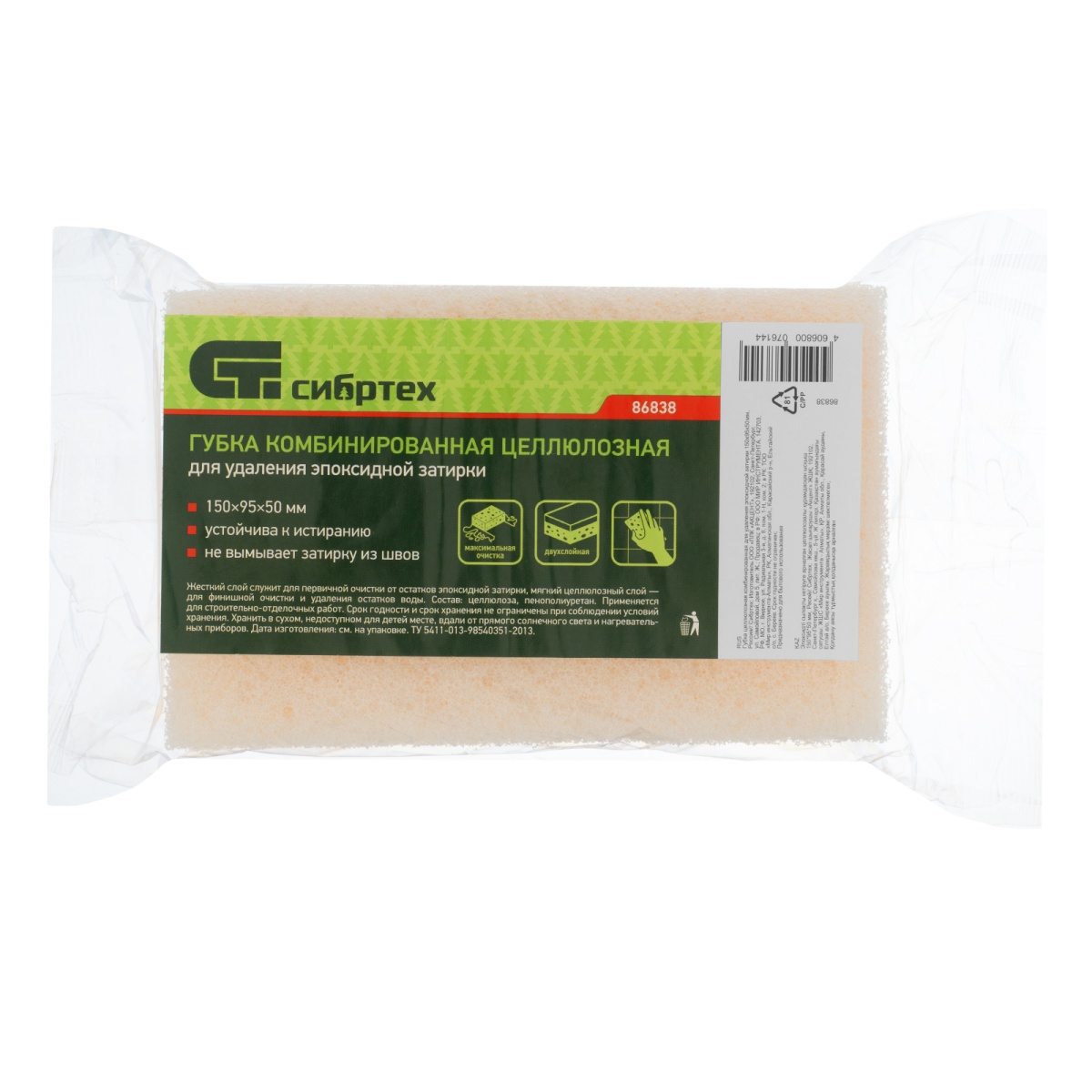 Губка целлюлозная комбинированная для удаления эпоксидной затирки 150 x 95 x 50 мм, Сибртех
