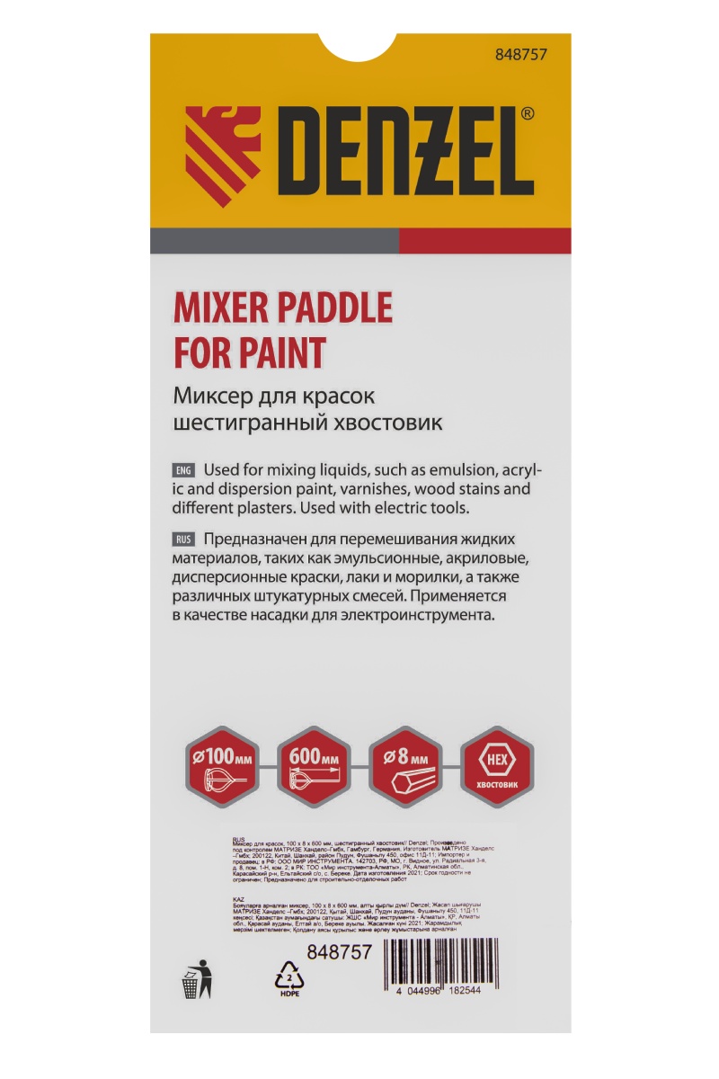 Наличие клапана для сброса давления Миксер для красок, 100 х 8 х 600 мм, шестигранный хвостовик Denzel