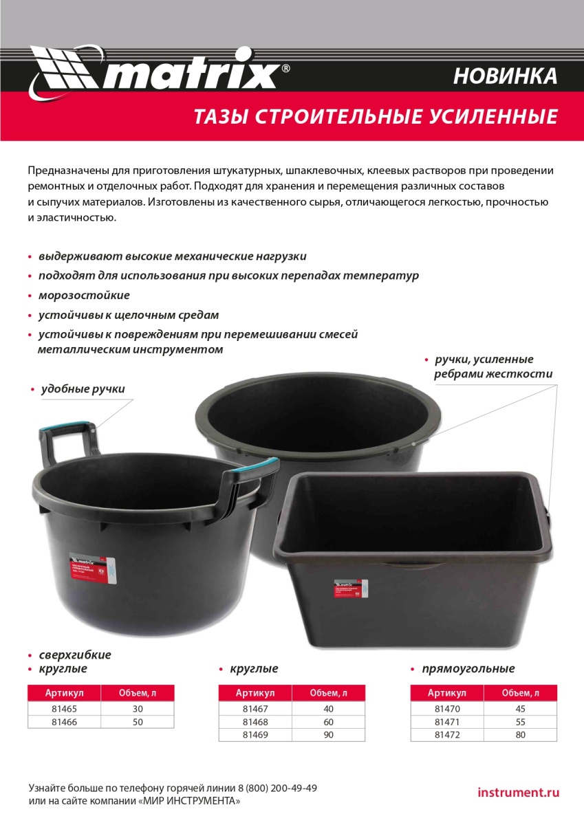 Купить Таз прямоугольный строительный усиленный, 45 л Matrix V7032 по лучшей цене с доставкой - интернет магазин №1 в России