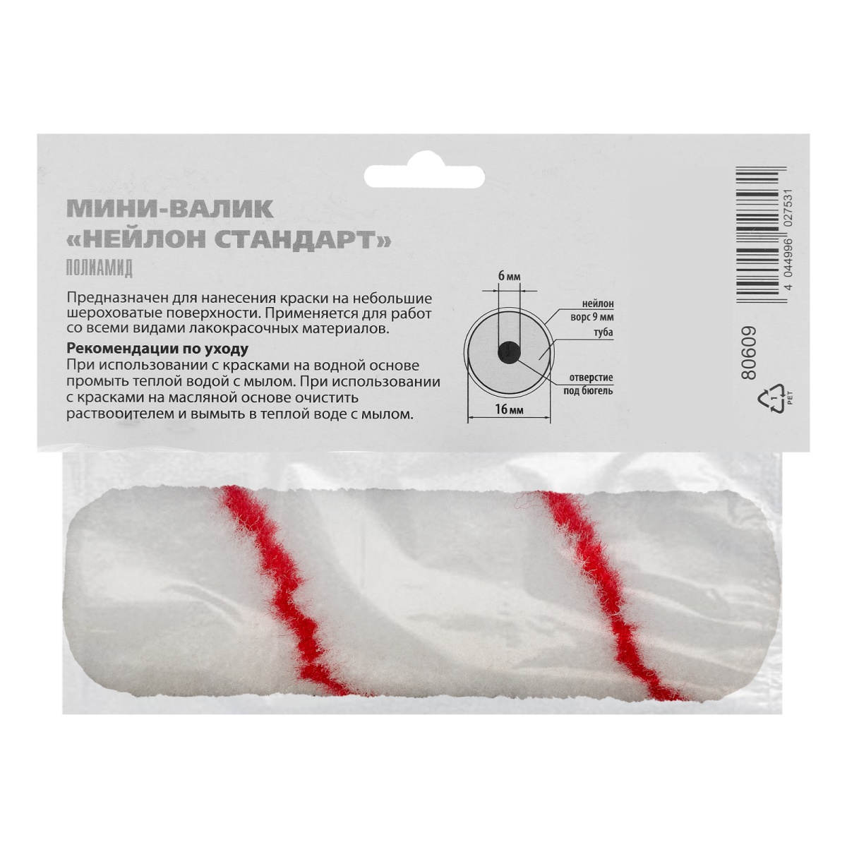 Наличие клапана для сброса давления Мини-валик сменный, "Нейлон Стандарт", 110 мм, ворс 9 мм, D 16 мм, D ручки 6 мм, полиамид MTX