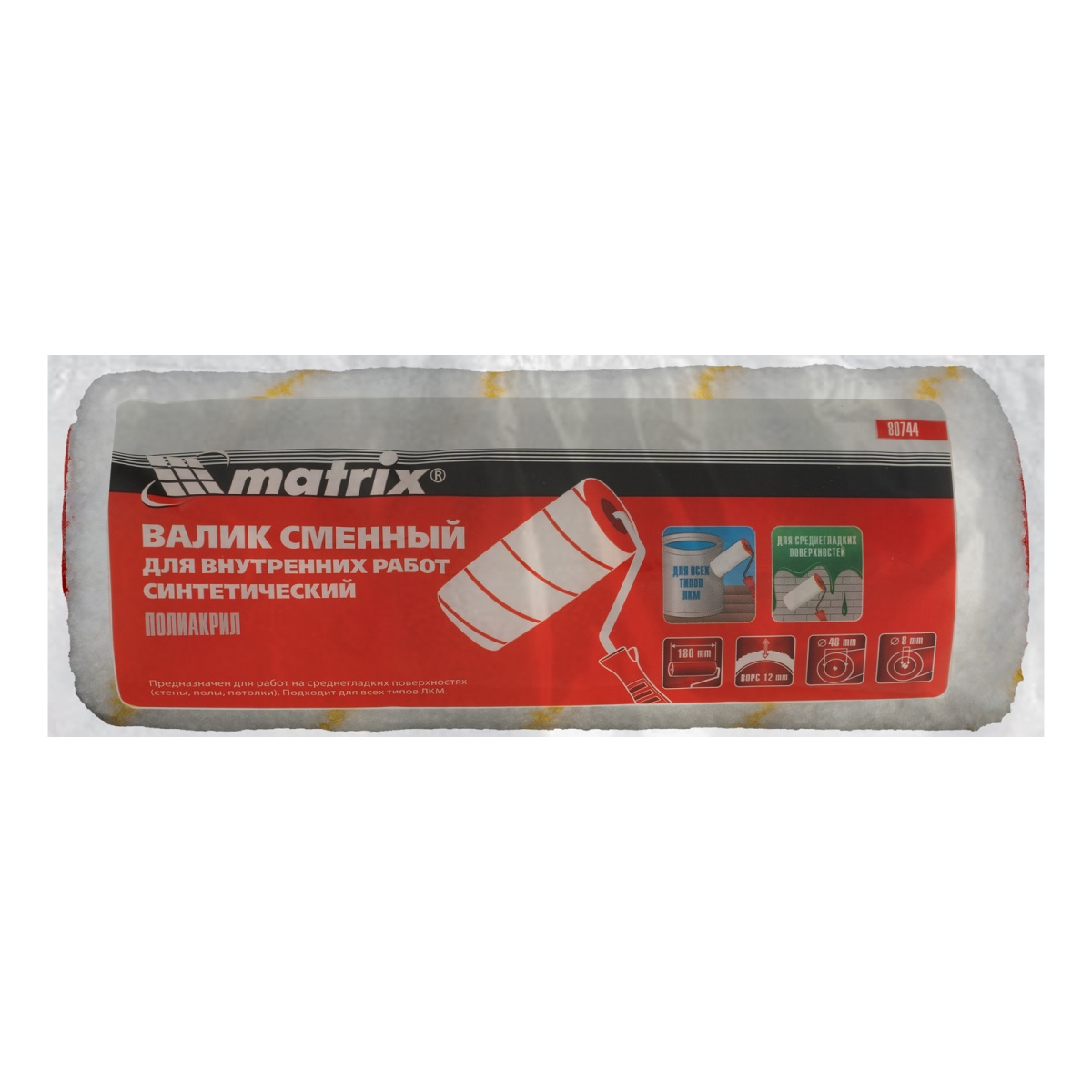 Валик сменный для внутренних работ синтетический, 180 мм, ворс 12 мм, D 48 мм, D ручки 8 мм, полиакрил Matrix