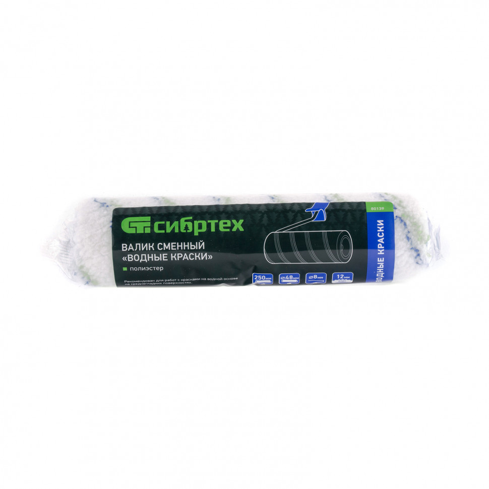 Купить Валик сменный "Водные краски", 250 мм, ворс 12 мм, D 48 мм, D ручки 8 мм, полиэстер Сибртех V1129 по лучшей цене с доставкой - интернет магазин №1 в России