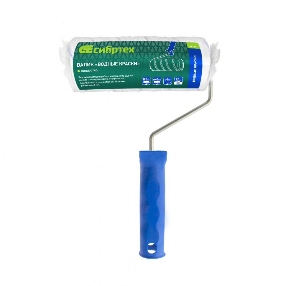 Купить Валик "Водные краски", 180 мм, ворс 12 мм, D - 48 мм, D ручки - 6 мм, полиэстер Сибртех V1025 по лучшей цене с доставкой - интернет магазин №1 в России
