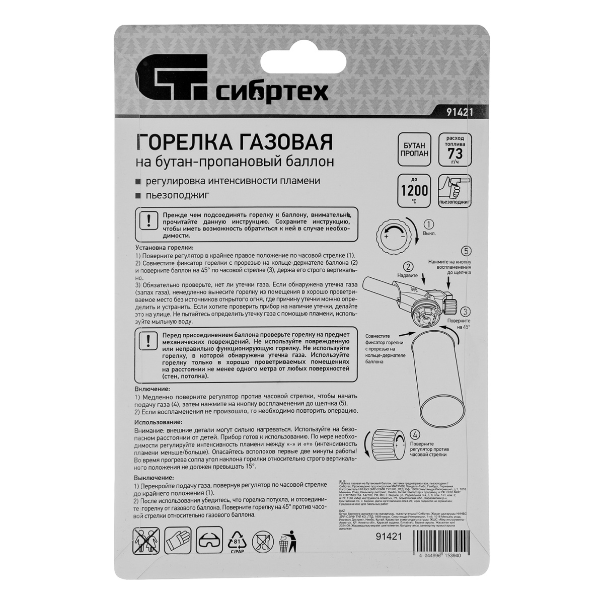 Наличие клапана для сброса давления Горелка газовая на бутановый баллон, пьезоподжиг Сибртех