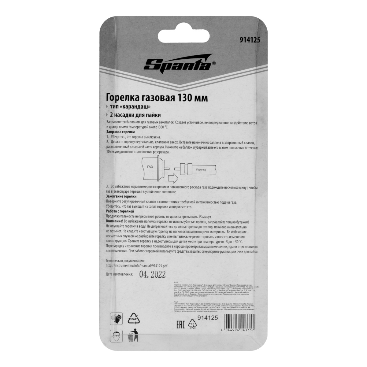Наличие клапана для сброса давления Горелка газовая, тип "Карандаш", 2 насадки для пайки, 130 мм Sparta
