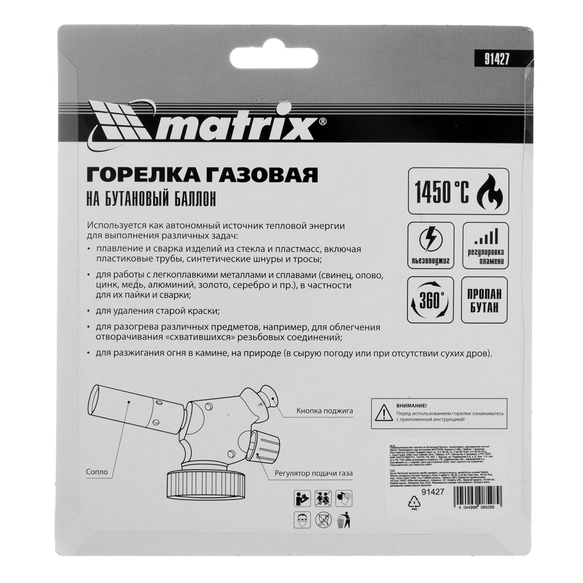 Профессиональная горелка на бутановый баллон, пьезоподжиг, расширенное сопло Matrix