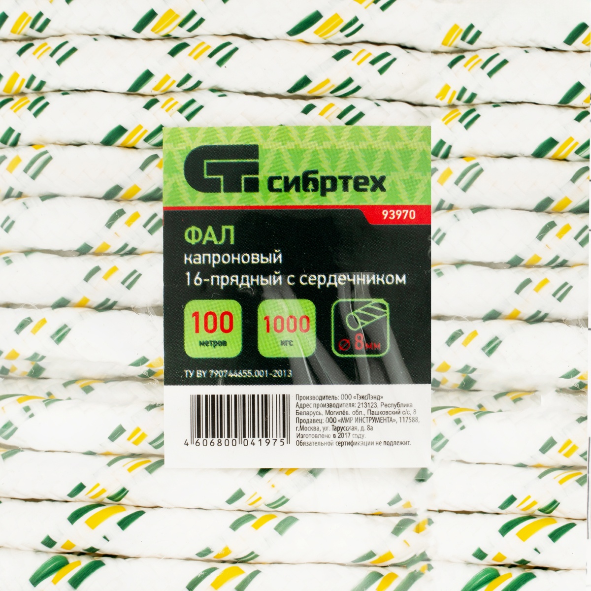 Фал плетеный капроновый с сердечником, 8 мм, L 100 м, 16-прядный, Сибртех