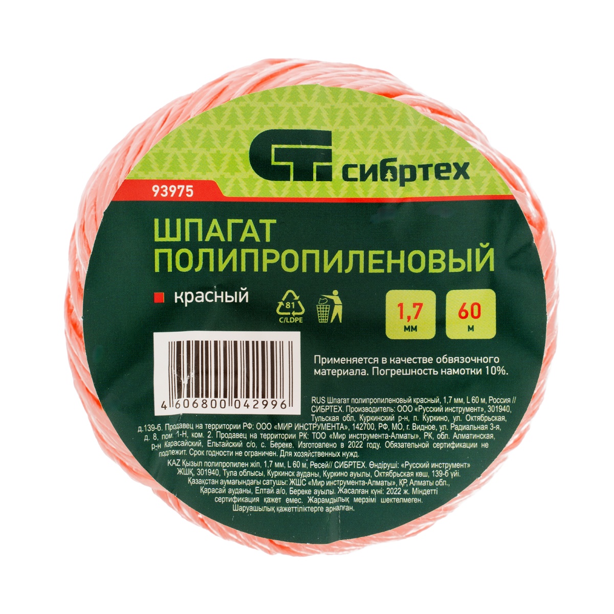 Купить Шпагат полипропиленовый красный, 1.7 мм, L 60 м, Сибртех V7875 по лучшей цене с доставкой - интернет магазин №1 в России