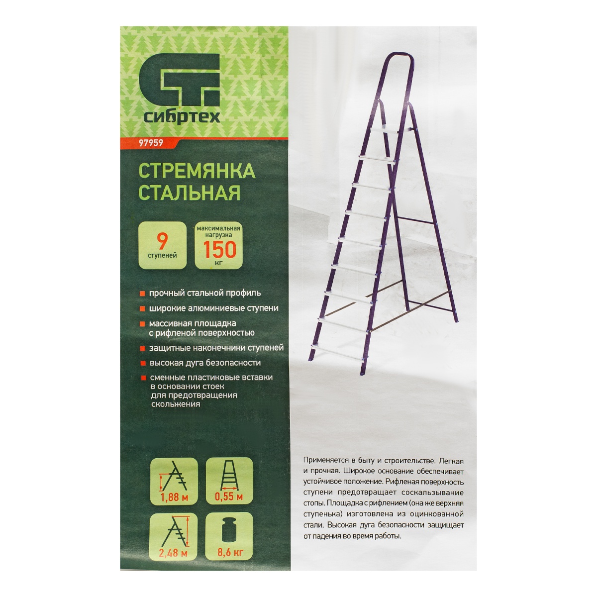 Купить Стремянка, 9 ступеней, стальной профиль, алюминиевые ступени Сибртех V6866 по лучшей цене с доставкой - интернет магазин №1 в России
