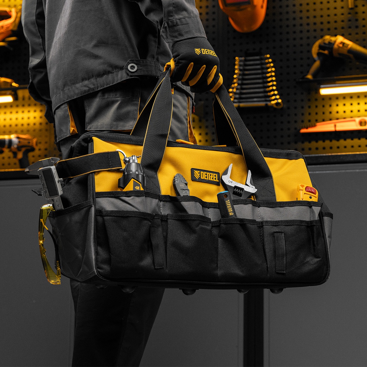 Наличие клапана для сброса давления Сумка для инструмента, 500х245х300 мм, 20 карман.,съемный органайз. 10 карман.,наплеч. рем. Denzel