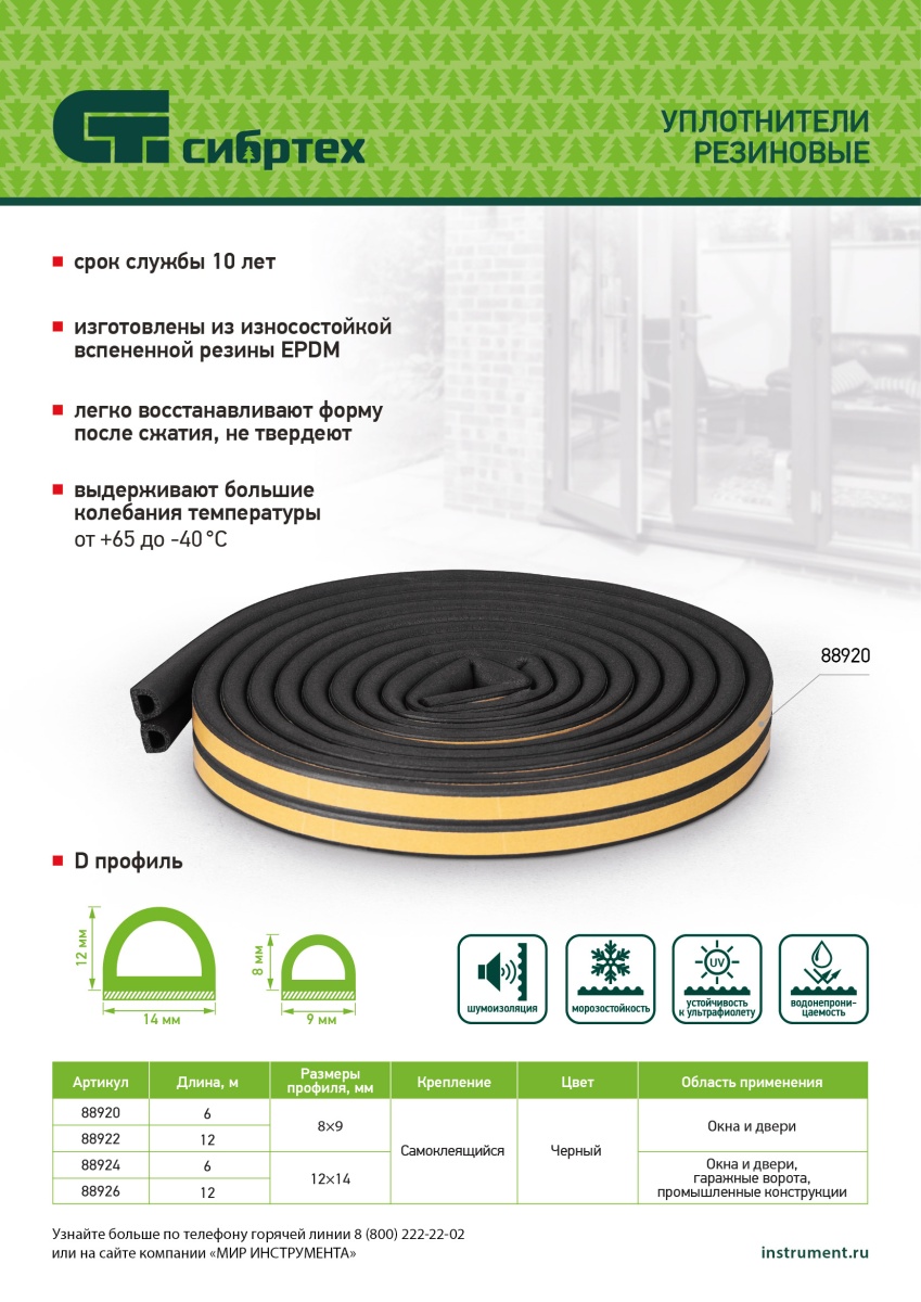 Купить Уплотнитель резиновый 14х12 мм для широких щелей, 6 м, профиль "D", черный Сибртех V7377 по лучшей цене с доставкой - интернет магазин №1 в России