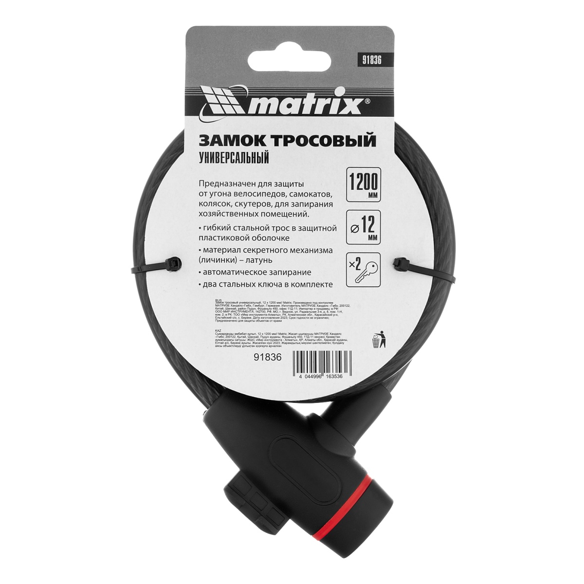 Купить Замок тросовый универсальный, 12 х 1200 мм Matrix V1874 по лучшей цене с доставкой - интернет магазин №1 в России
