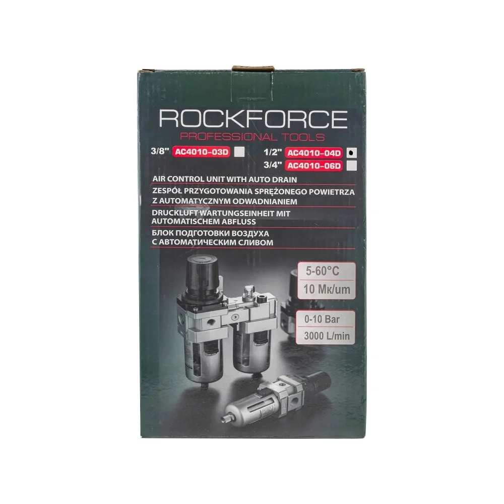 Купить Блок подготовки воздуха 1/2'', фильтр-регулятор + лубрикатор (10 Мк, 3000 л/мин, 0-10 bar, рабочая температура 5°-60°, автоматический слив) Rockforce RF-AC4010-04D(54486) по лучшей цене с доставкой - интернет магазин №1 в России