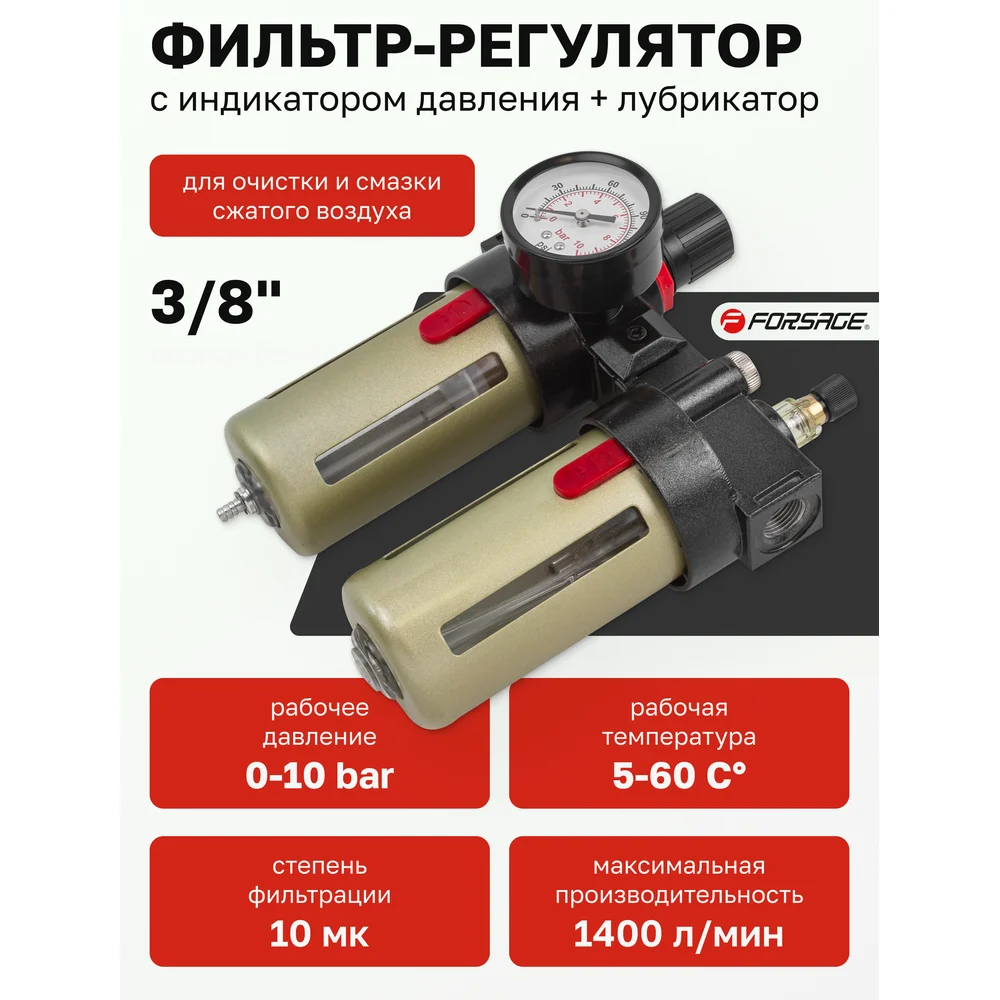 Купить Блок подготовки воздуха 3/8" фильтр-регулятор+лубрикатор (10 Мк, 1400 л/мин, 0-10 bar, рабочая температура 5-60°) Forsage F-BFC3000(54468) по лучшей цене с доставкой - интернет магазин №1 в России