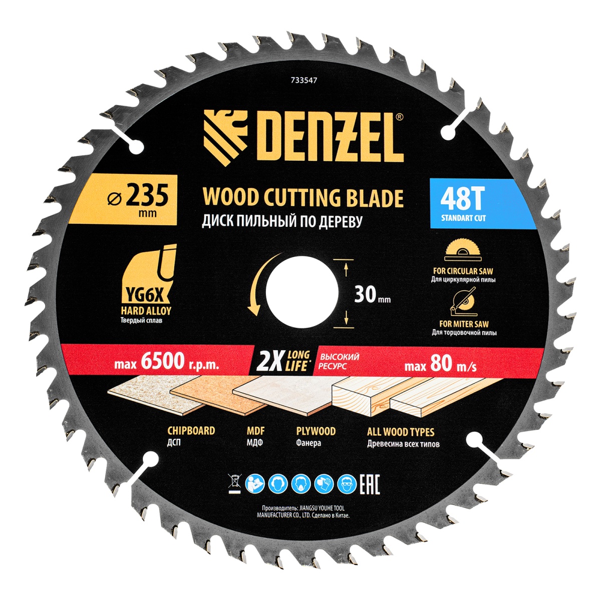 Пильный диск по дереву ф235 х 30 мм, 48 зубьев Denzel