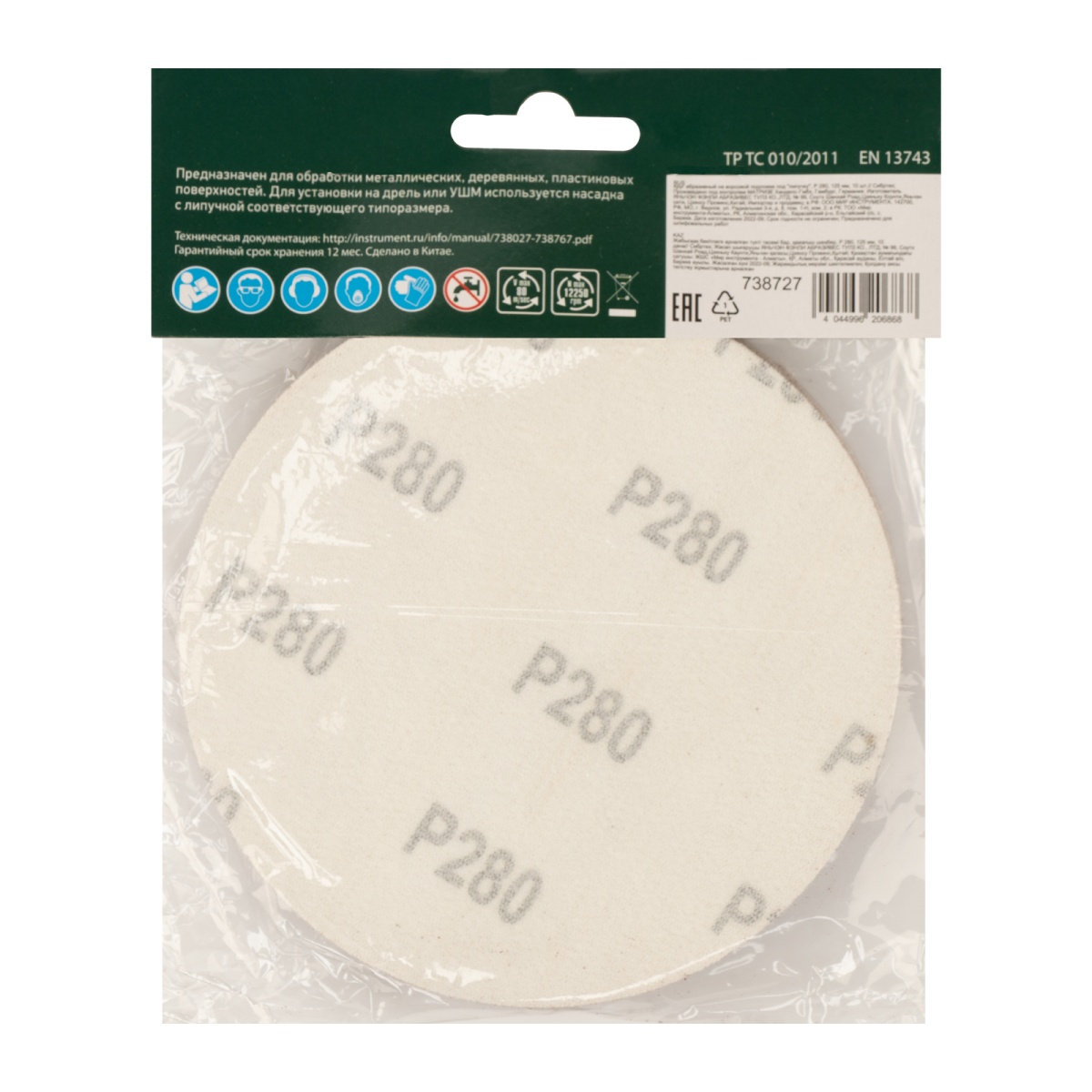 Купить Круг абразивный на ворсовой подложке под "липучку", P 280, 125 мм, 10 шт Сибртех V2967 по лучшей цене с доставкой - интернет магазин №1 в России