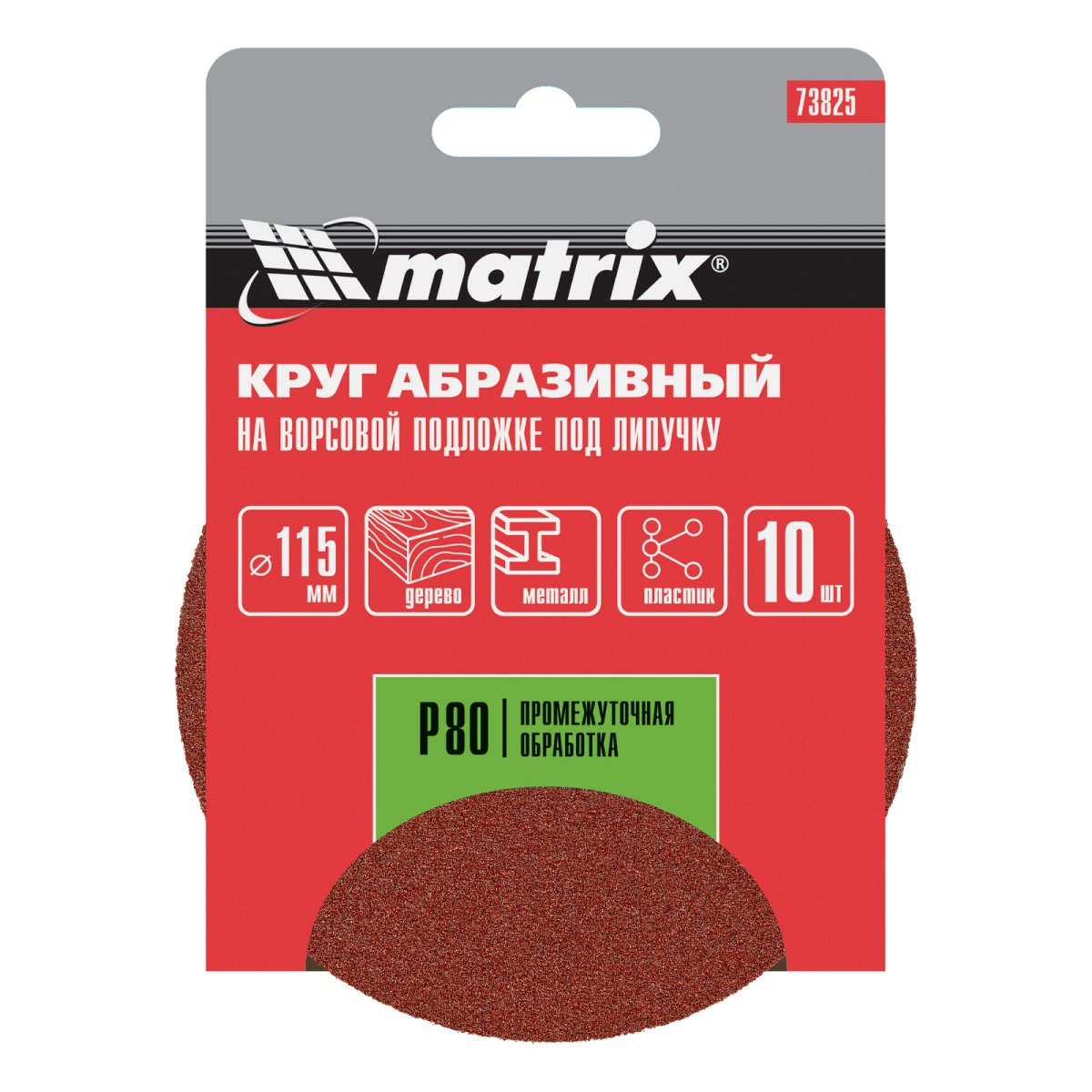 Круг абразивный на ворсовой подложке под "липучку", P 80, 115 мм, 10 шт Matrix