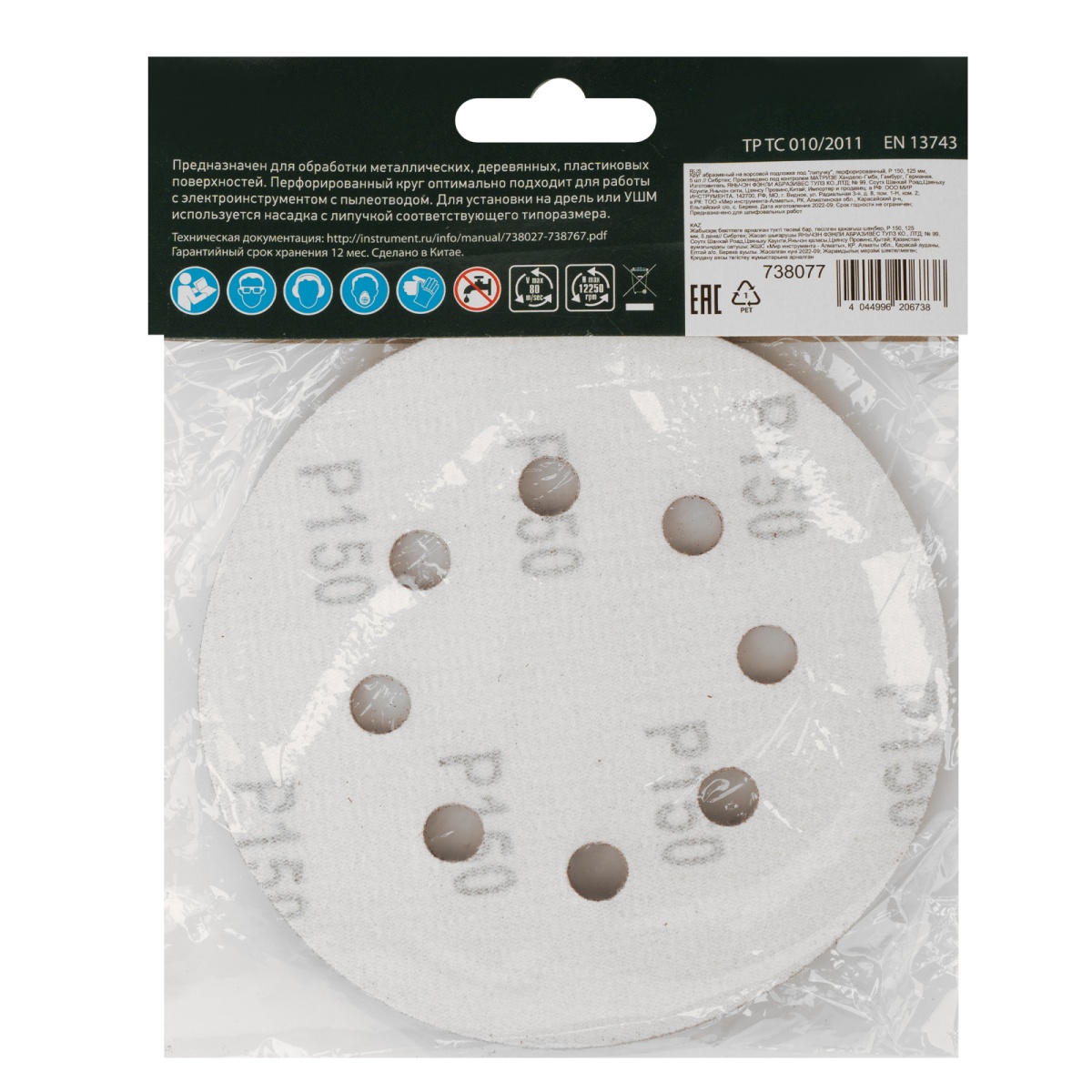 Круг абразивный на ворсовой подложке под "липучку", перфорированный, P 150, 125 мм, 5 шт Сибртех