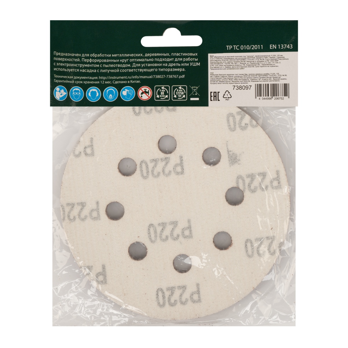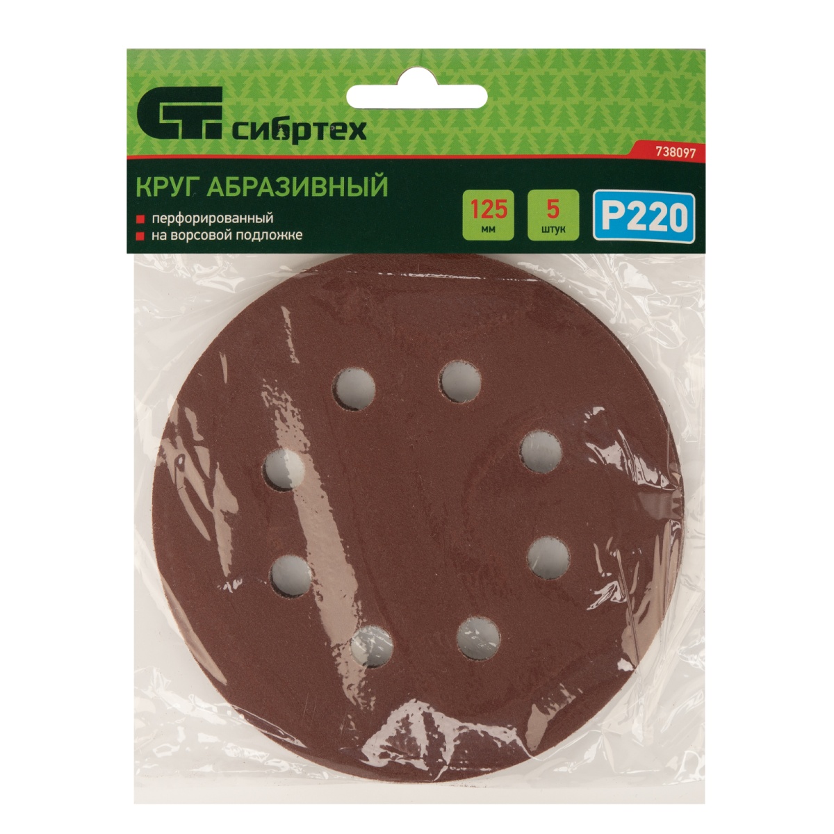 Купить Круг абразивный на ворсовой подложке под "липучку", перфорированный, P 220, 125 мм, 5 шт Сибртех V2999 по лучшей цене с доставкой - интернет магазин №1 в России