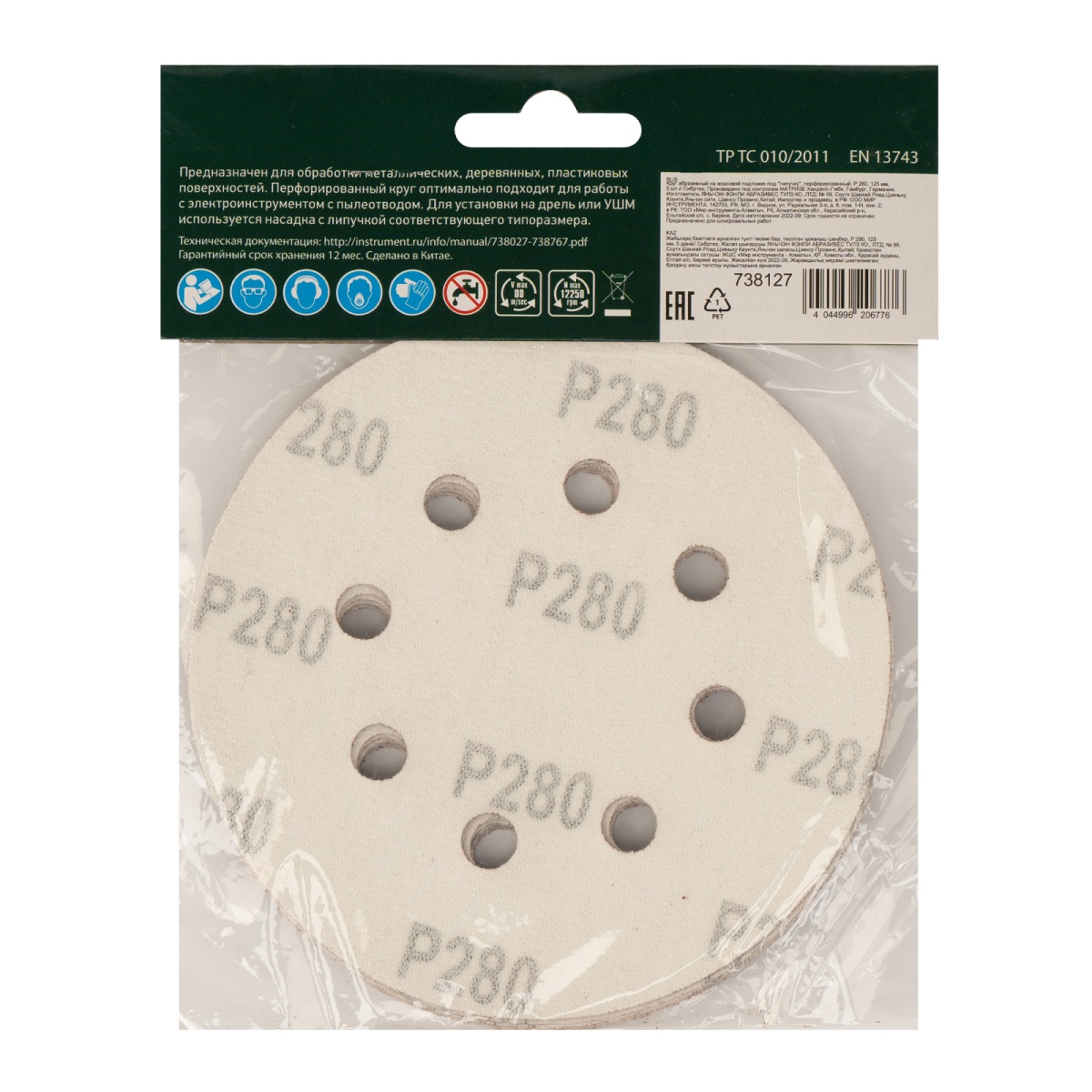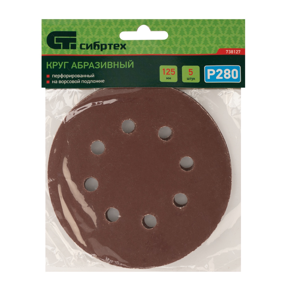 Купить Круг абразивный на ворсовой подложке под "липучку", перфорированный, P 280, 125 мм, 5 шт Сибртех V3002 по лучшей цене с доставкой - интернет магазин №1 в России