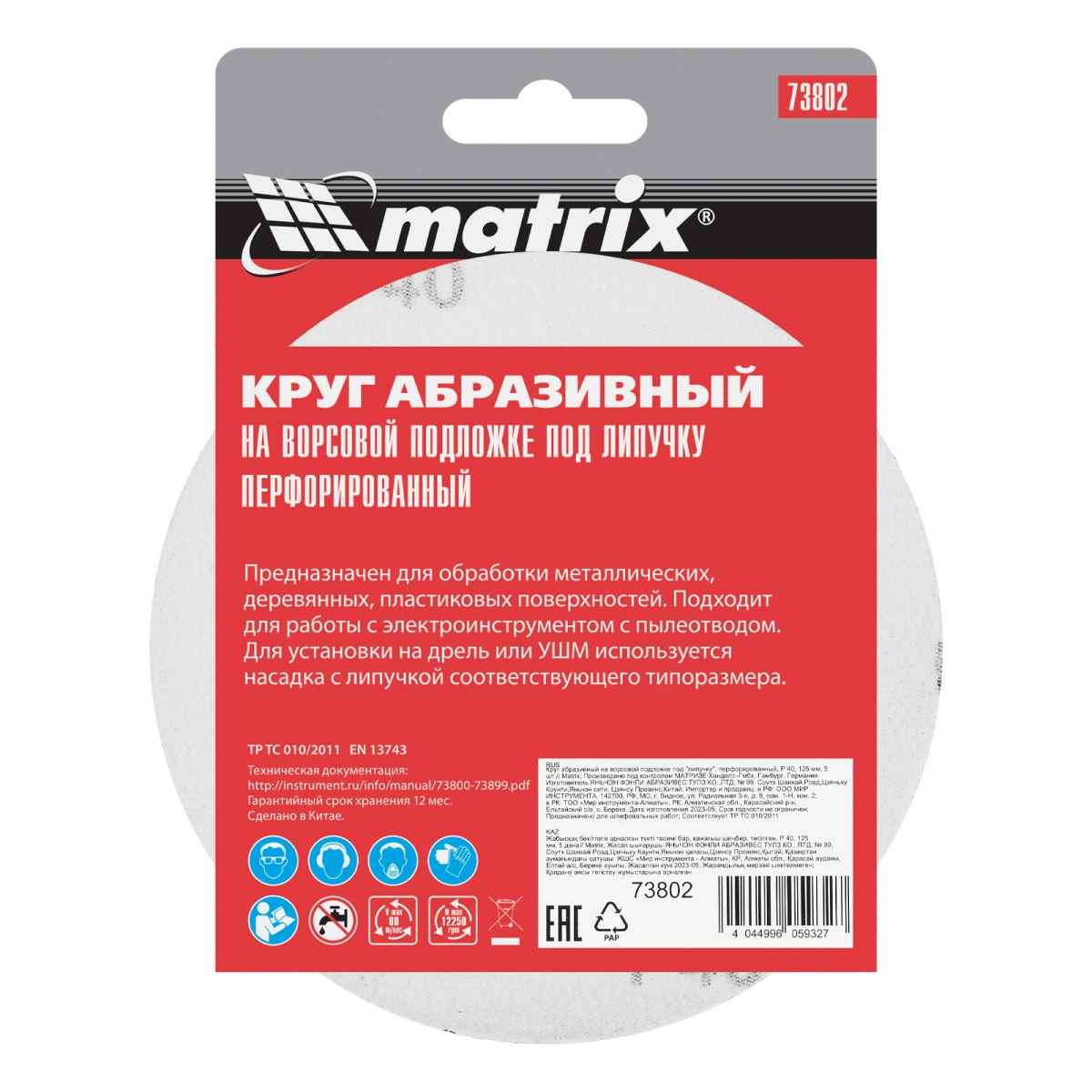 Купить Круг абразивный на ворсовой подложке под "липучку", перфорированный, P 40, 125 мм, 5 шт Matrix V3005 по лучшей цене с доставкой - интернет магазин №1 в России