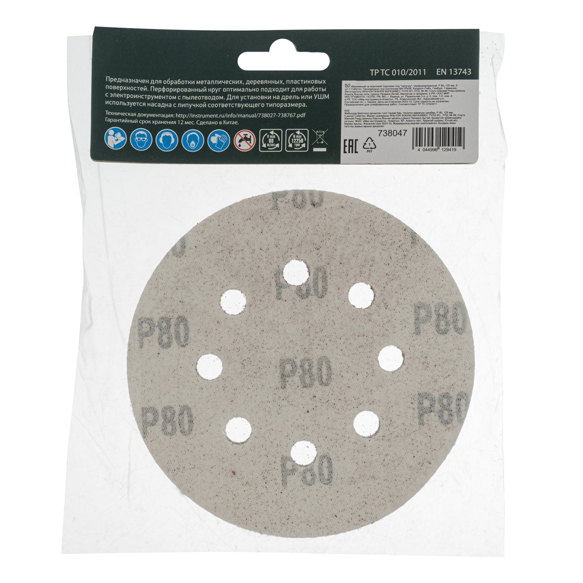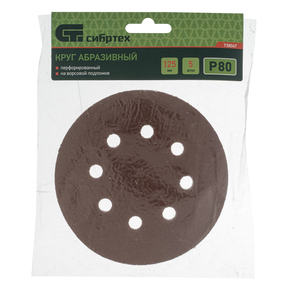 Купить Круг абразивный на ворсовой подложке под "липучку", перфорированный, P 80, 125 мм, 5 шт Сибртех V3015 по лучшей цене с доставкой - интернет магазин №1 в России