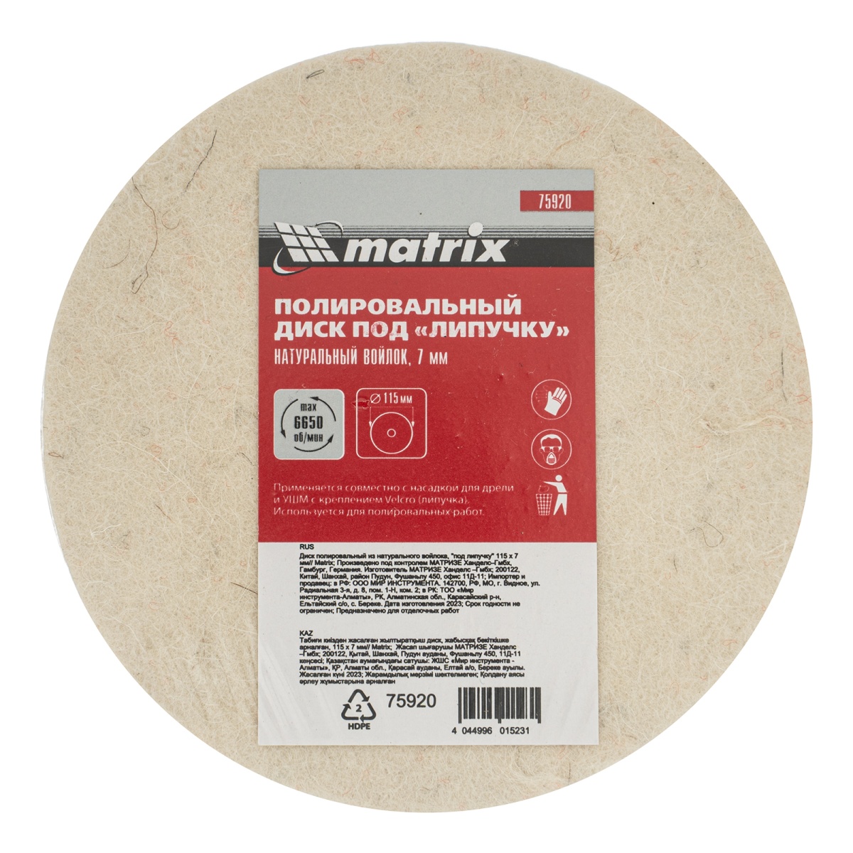 Купить Диск полировальный из натурального войлока, "под липучку" 115 х 7 мм Matrix V1682 по лучшей цене с доставкой - интернет магазин №1 в России