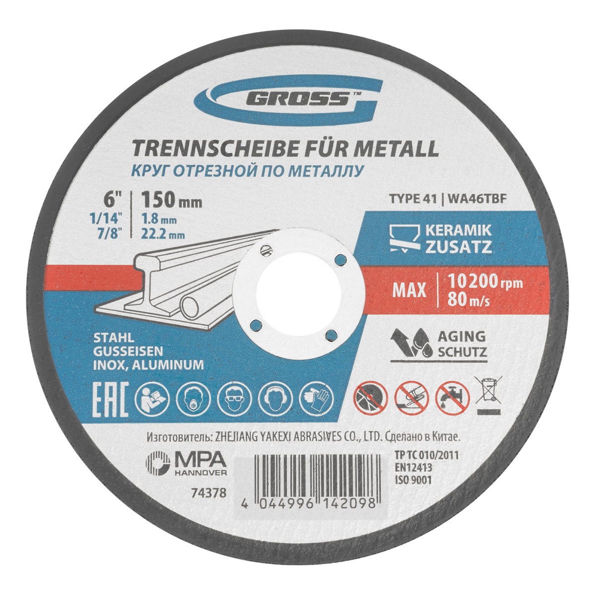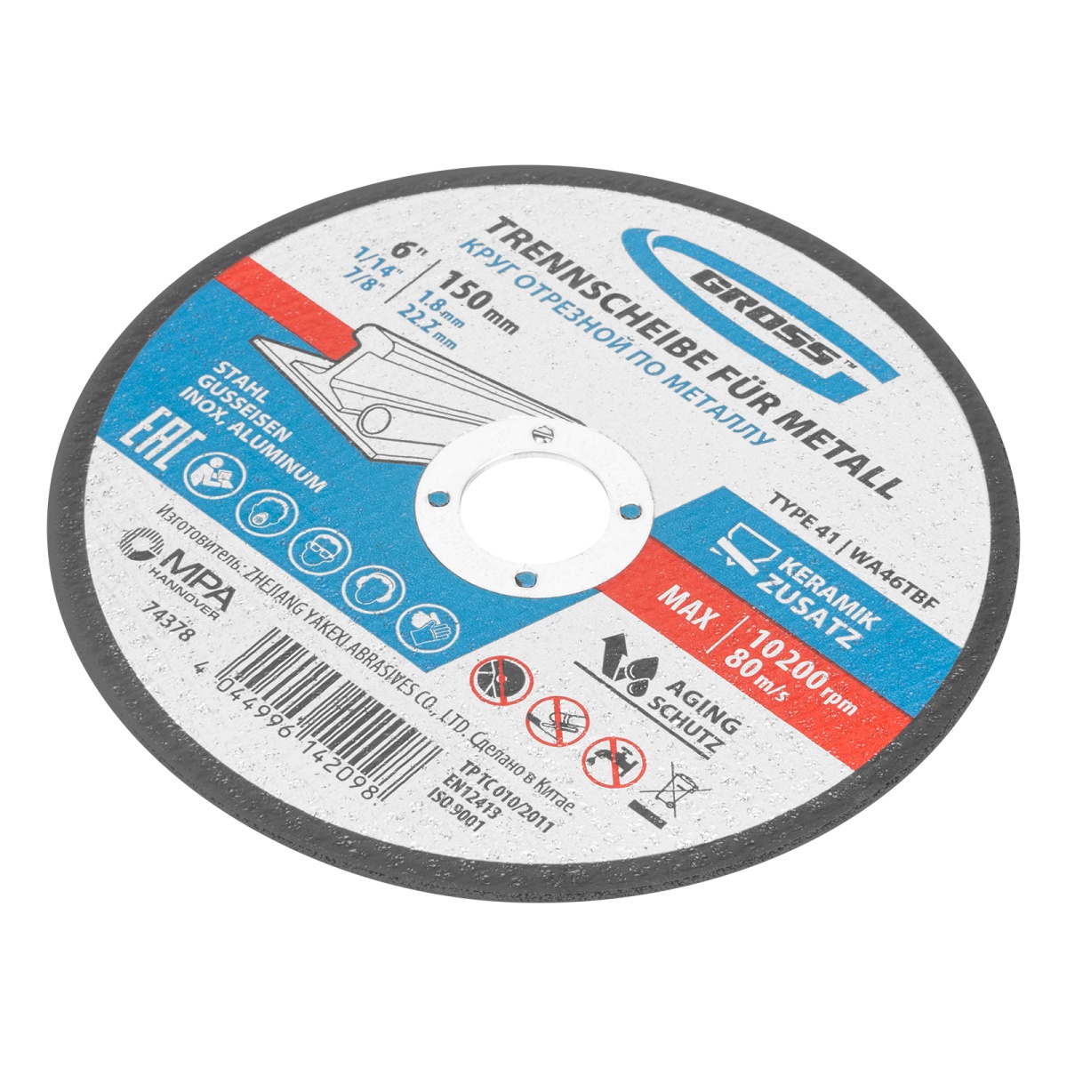Наличие клапана для сброса давления Круг отрезной по металлу, 150 х 1,8 х 22,2 мм, WA46TBF// Gross