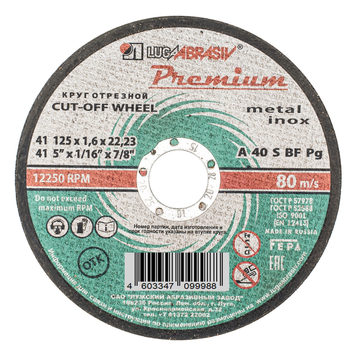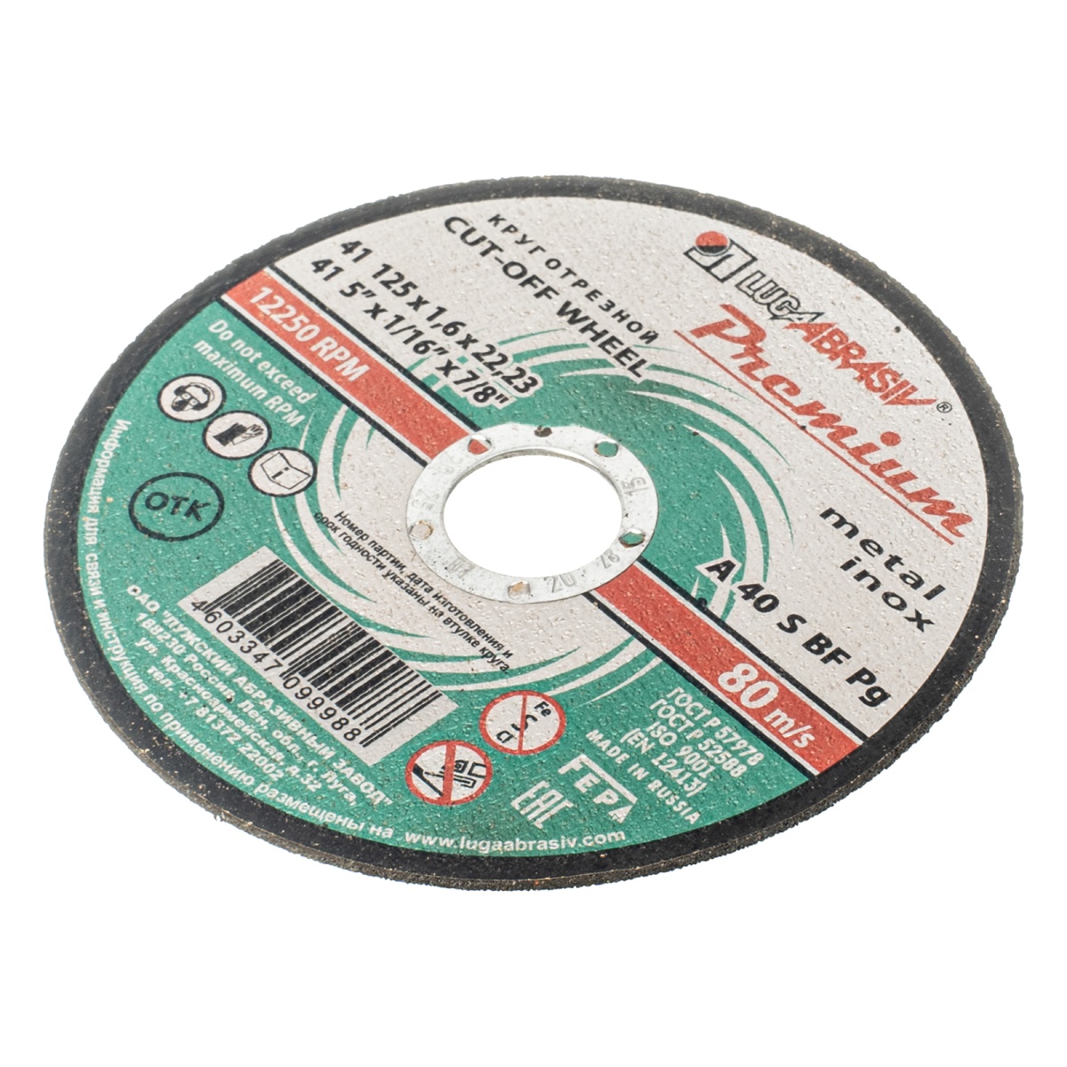 Наличие клапана для сброса давления Круг отрезной по металлу и нержавеющей стали, 125 х 1.6 х 22 мм, Премиум "Луга"