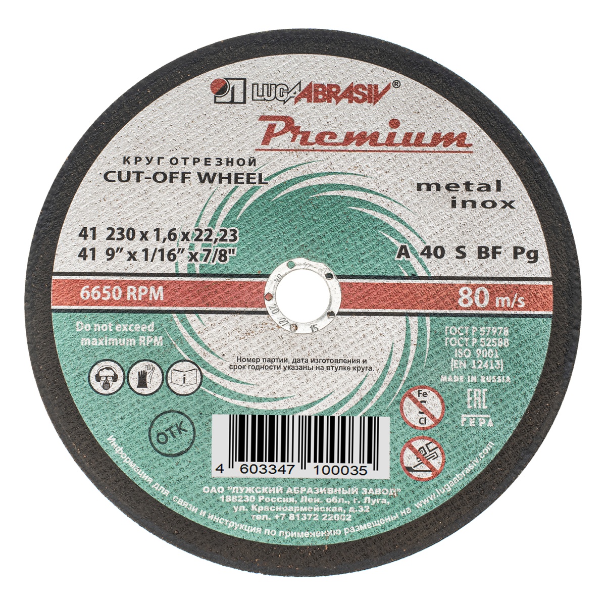 Наличие клапана для сброса давления Круг отрезной по металлу и нержавеющей стали, 230 х 1.6 х 22 мм, Премиум "Луга"