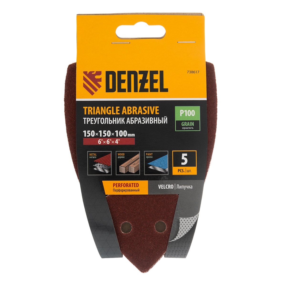 Купить Треугольник абразивный на ворc. подложке под "липучку", перф., P 100, 150х150х100 мм, 5 шт. Denzel V7235 по лучшей цене с доставкой - интернет магазин №1 в России
