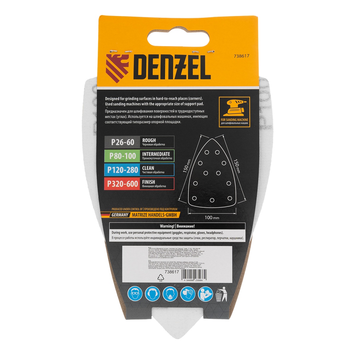 Наличие клапана для сброса давления Треугольник абразивный на ворc. подложке под "липучку", перф., P 100, 150х150х100 мм, 5 шт. Denzel