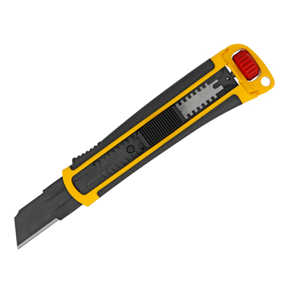 Купить Нож, 25 мм, сменное лезвие, SK4, корпус из ABS + TPR, торцевой зажим Denzel V4828 по лучшей цене с доставкой - интернет магазин №1 в России