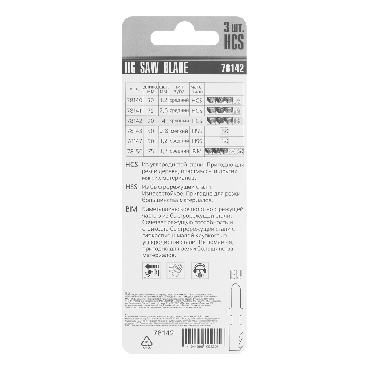 Полотна для электролобзика по дереву, 3 шт, 90 х 4 мм, HCS, EU- хвостовик Matrix