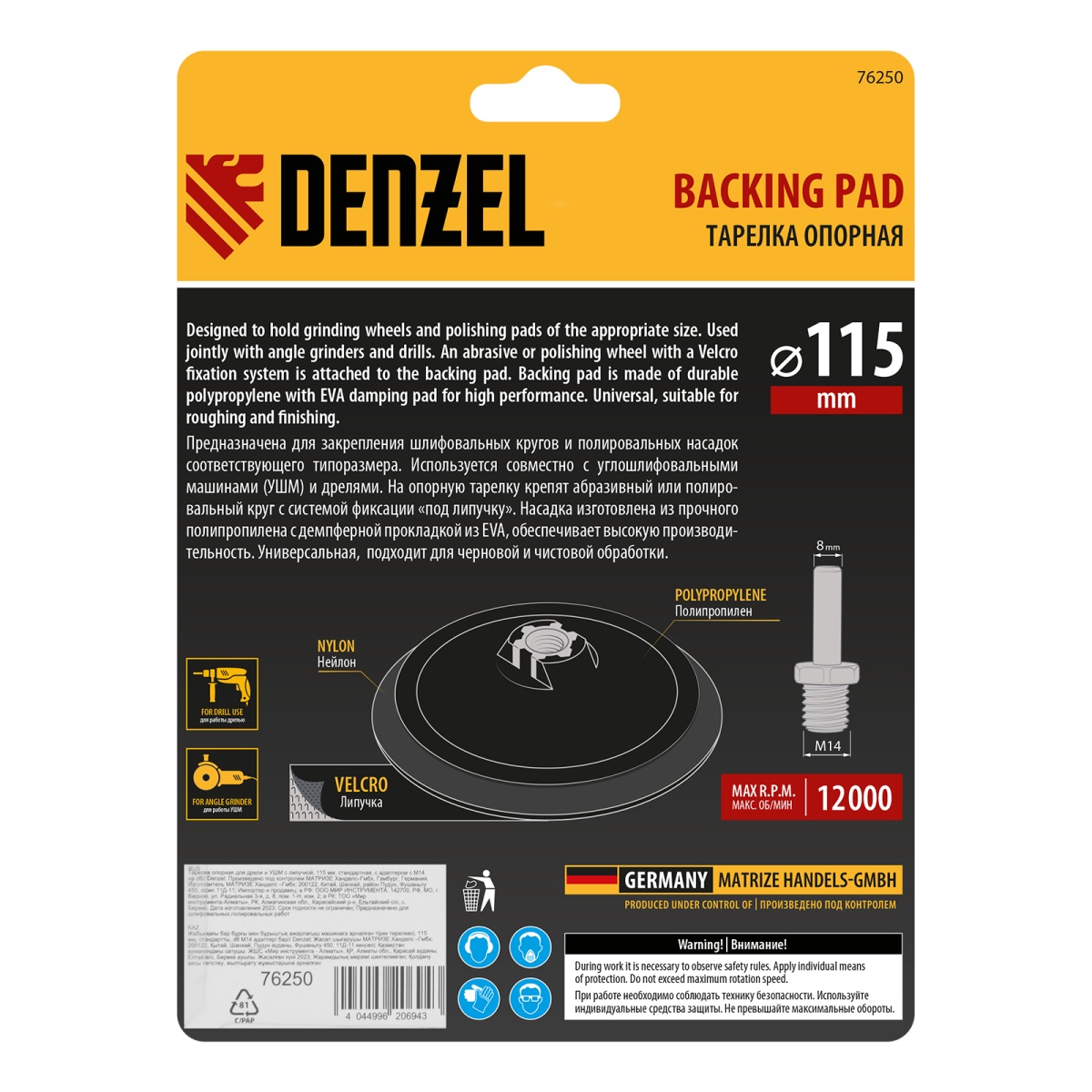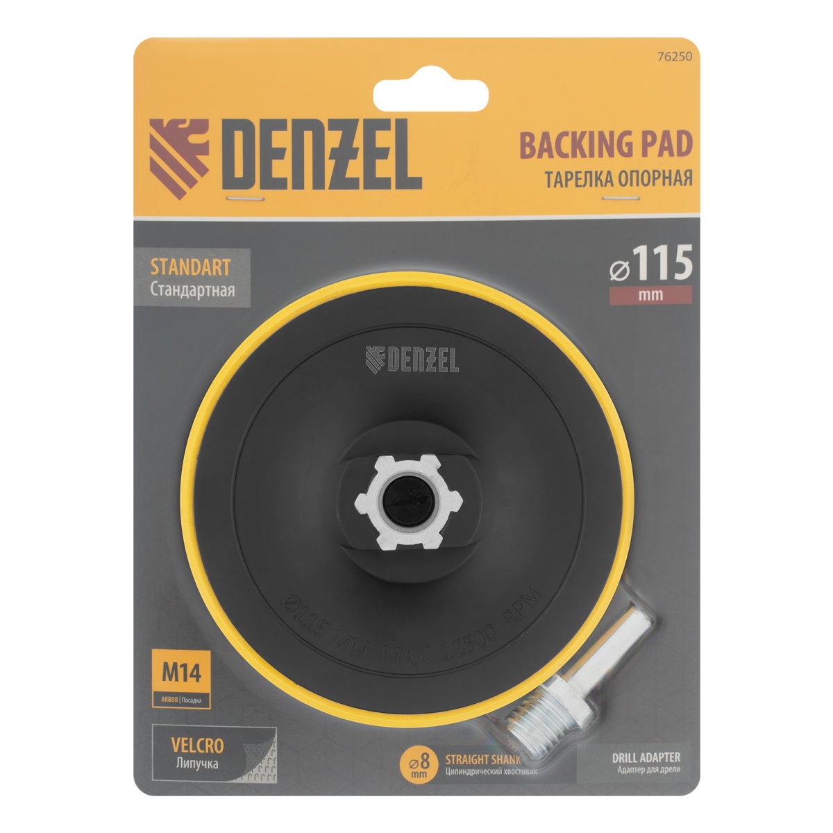 Тарелка опорная для дрели и УШМ с липучкой, 115 мм, стандартная, с адаптером c М14 на d8 Denzel