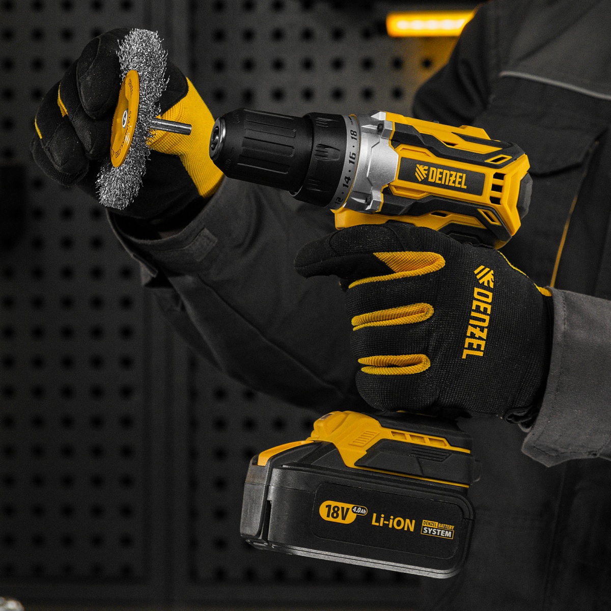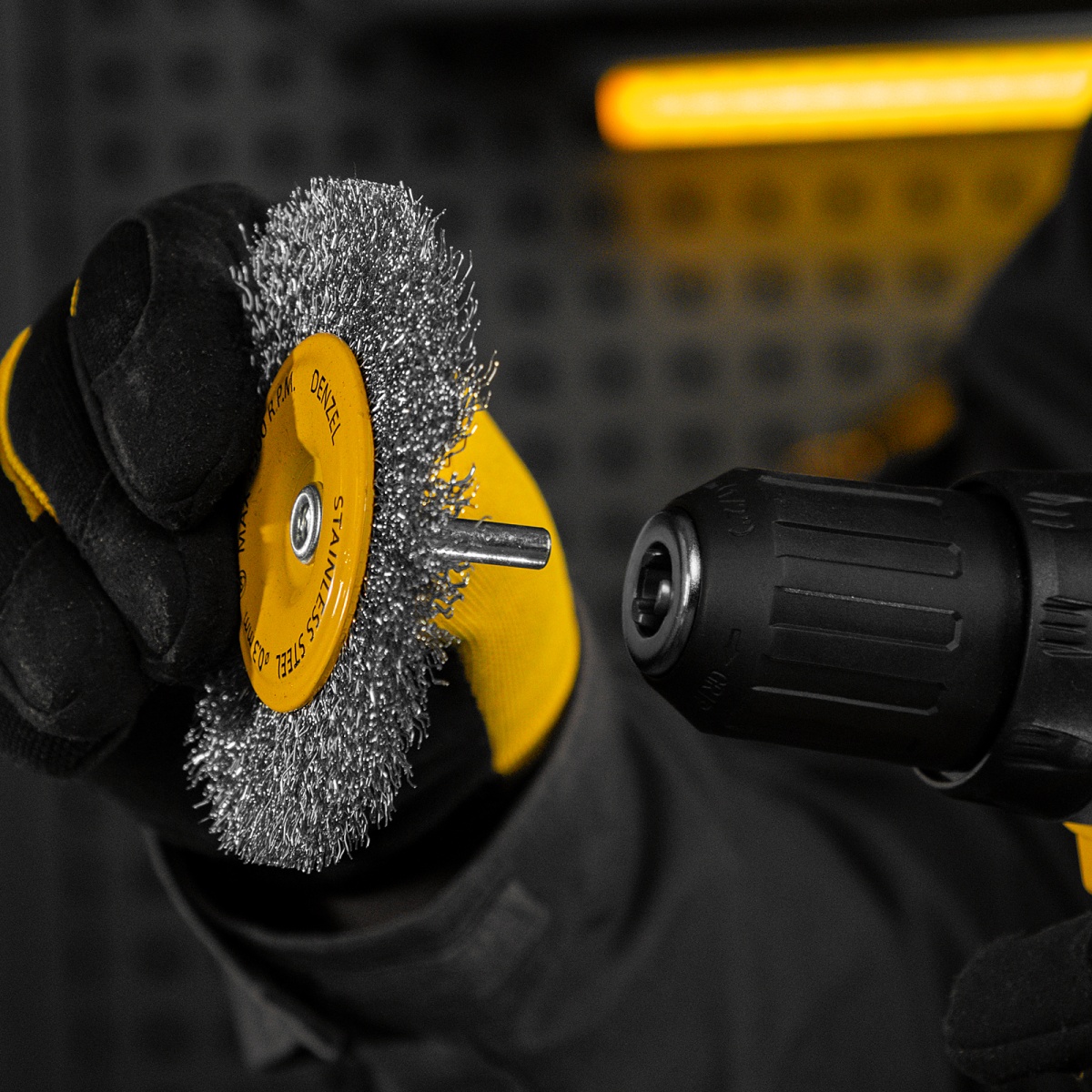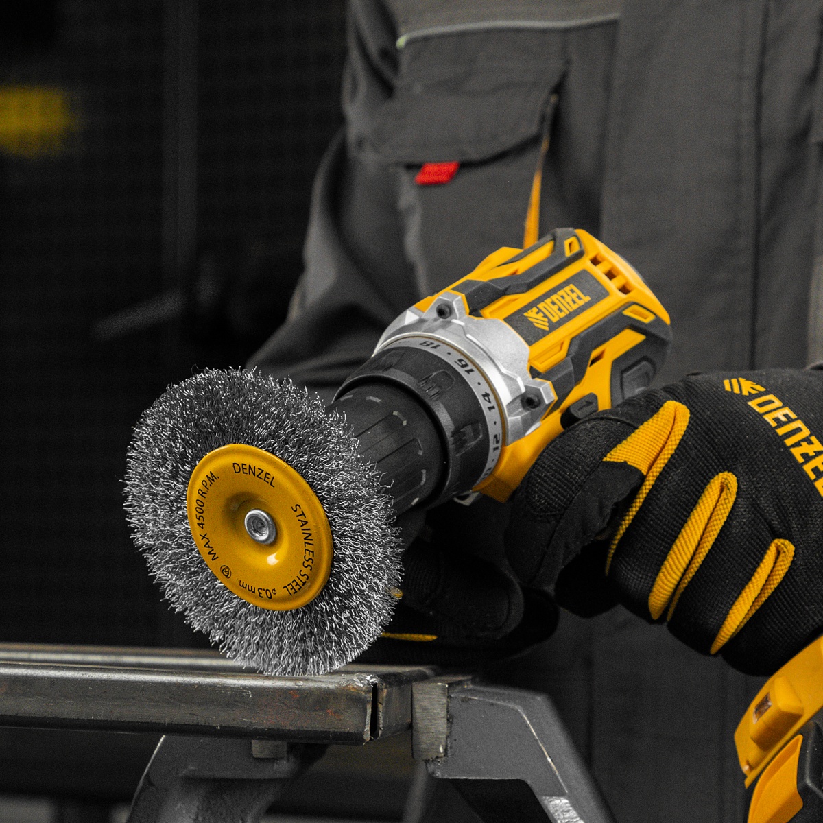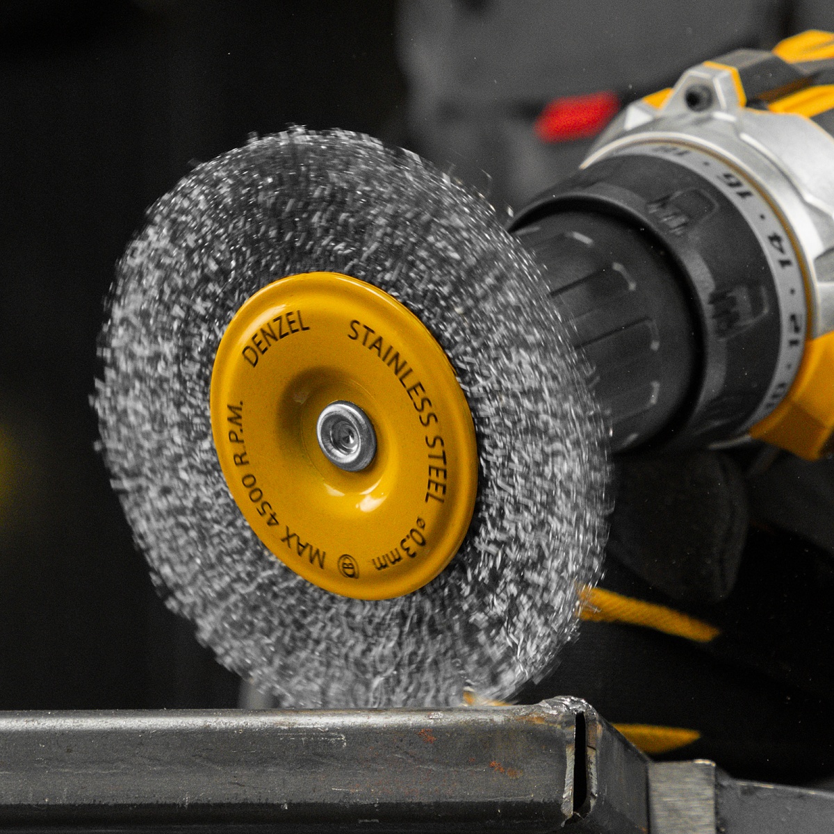 Наличие клапана для сброса давления Щетка для дрели 100 мм, Плоская, со шпилькой, нержавеющая витая проволока Denzel