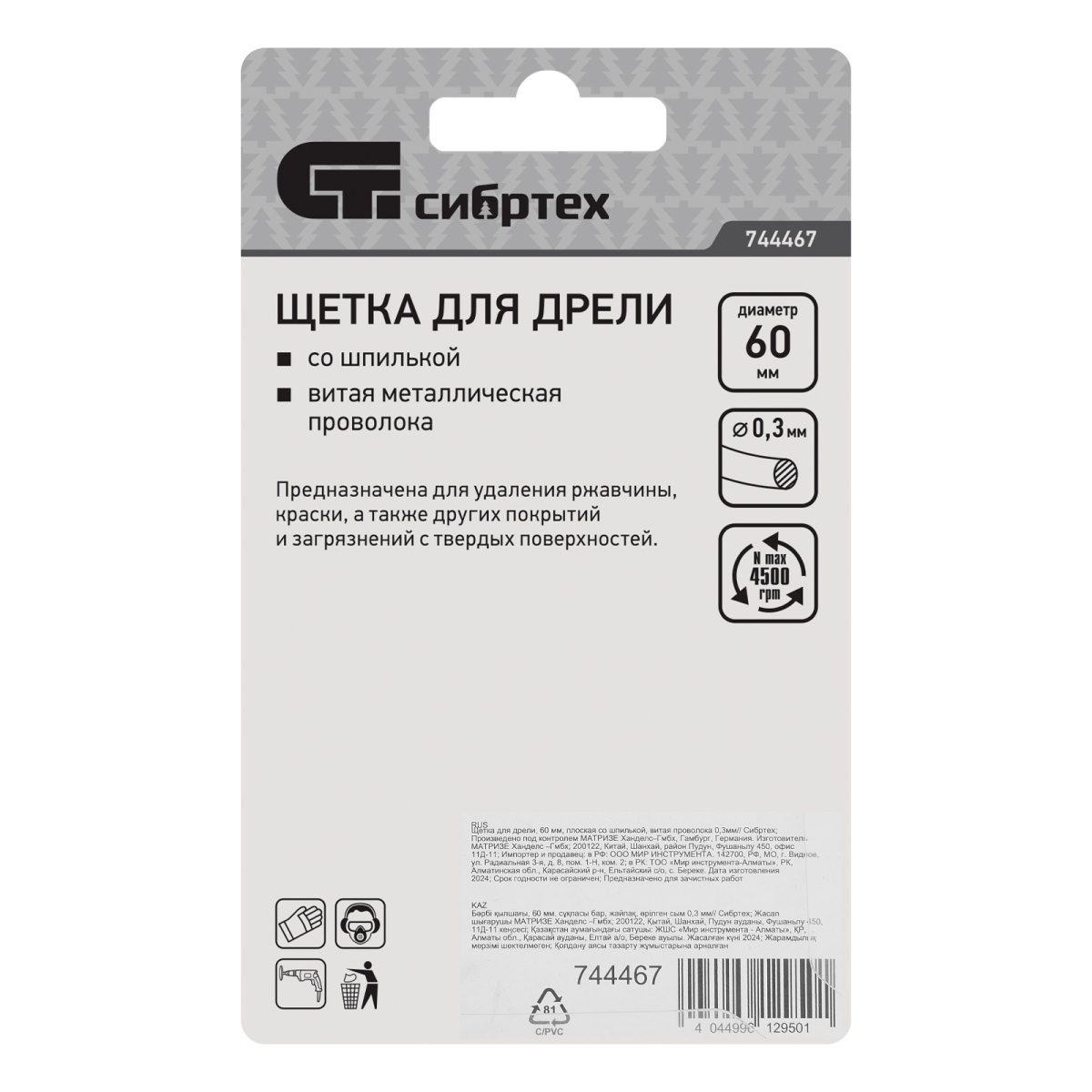 Купить Щетка для дрели, 60 мм, плоская со шпилькой, витая проволока Сибртех V8049 по лучшей цене с доставкой - интернет магазин №1 в России