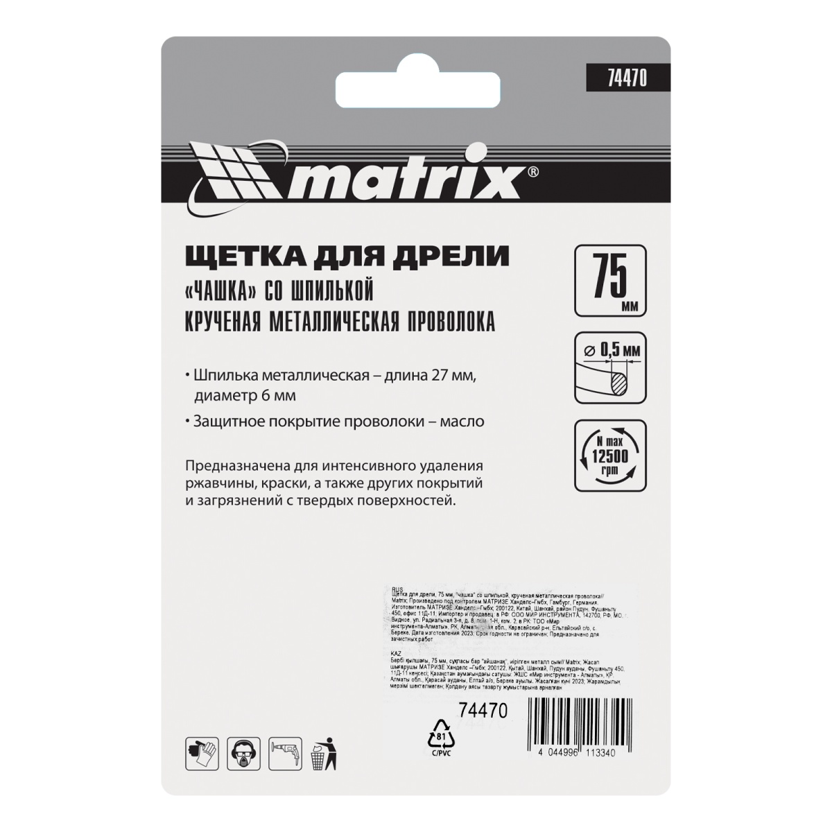 Купить Щетка для дрели, 75 мм, "чашка" со шпилькой, крученая металлическая проволока Matrix V8059 по лучшей цене с доставкой - интернет магазин №1 в России