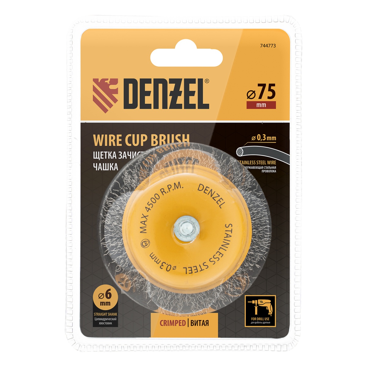 Купить Щетка для дрели, 75 мм, Чашка, со шпилькой, нержавеющая витая проволока Denzel V8065 по лучшей цене с доставкой - интернет магазин №1 в России