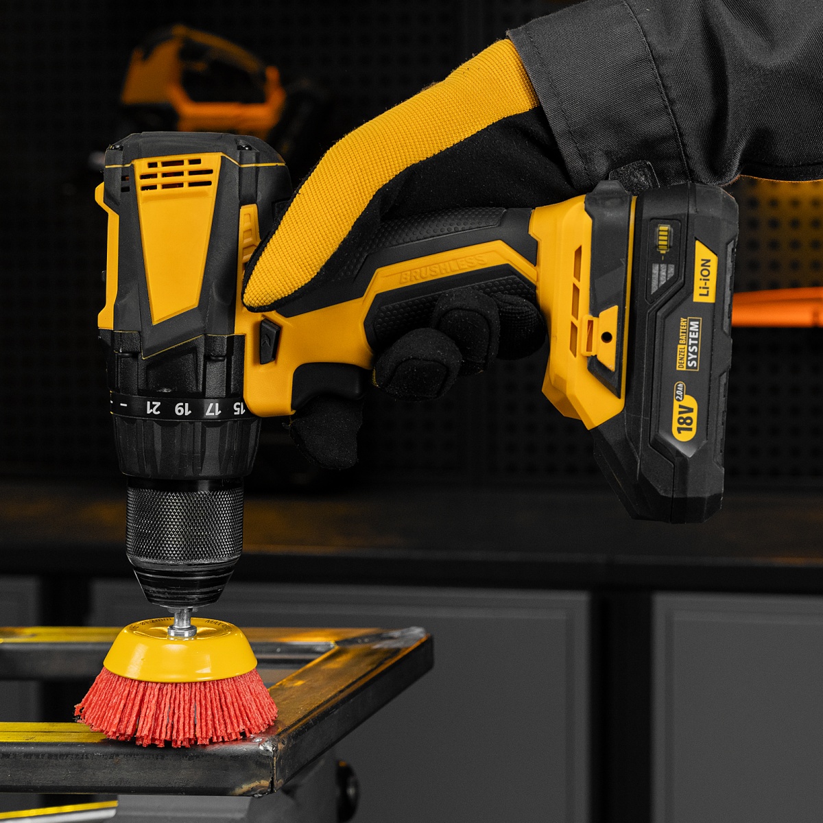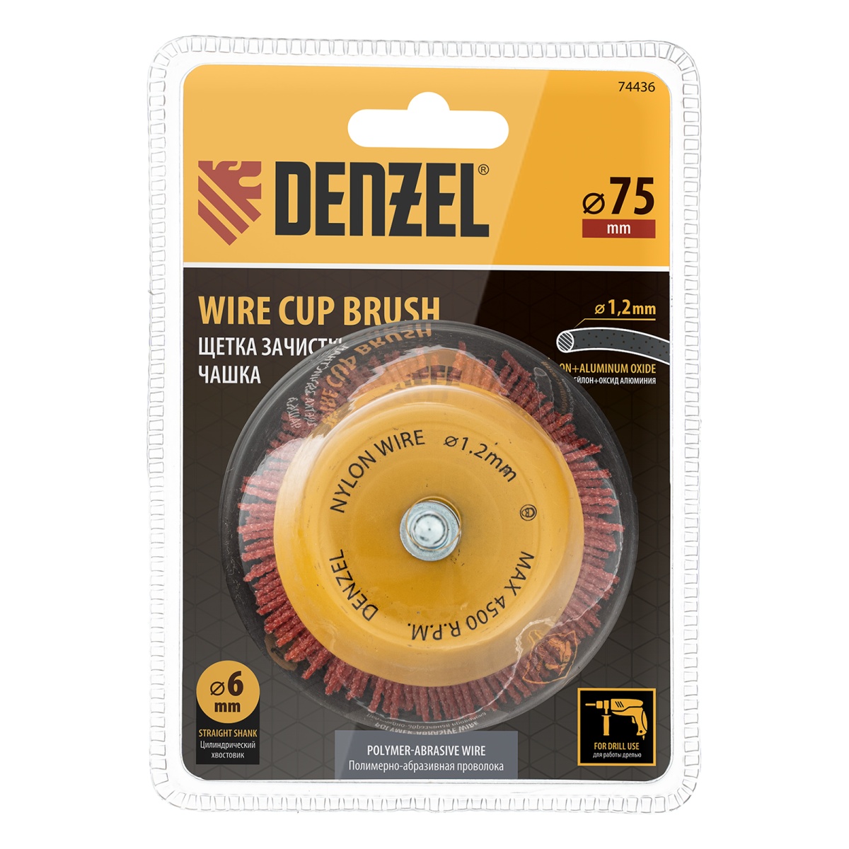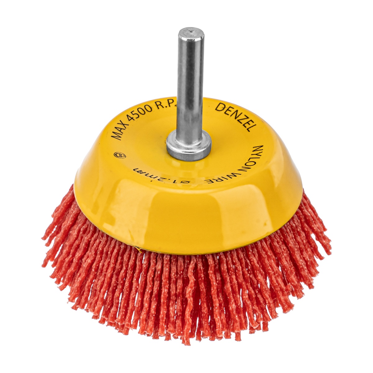 Наличие клапана для сброса давления Щетка для дрели, 75 мм, Чашка, со шпилькой, нейлоновая щетина Denzel