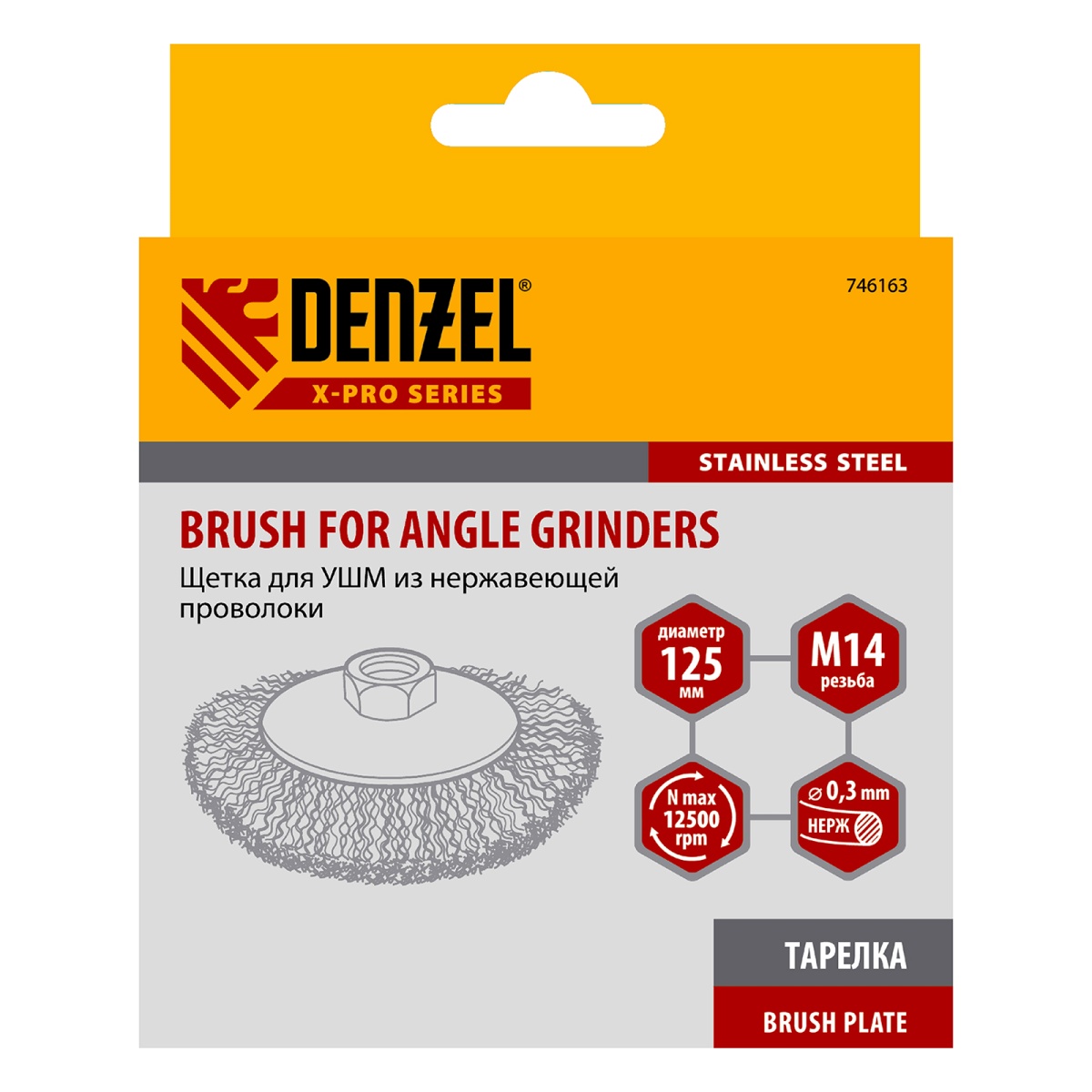 Щетка для УШМ, 125 мм, "Тарелка", витая нержавеющая проволока 0.3 мм, М14 Denzel