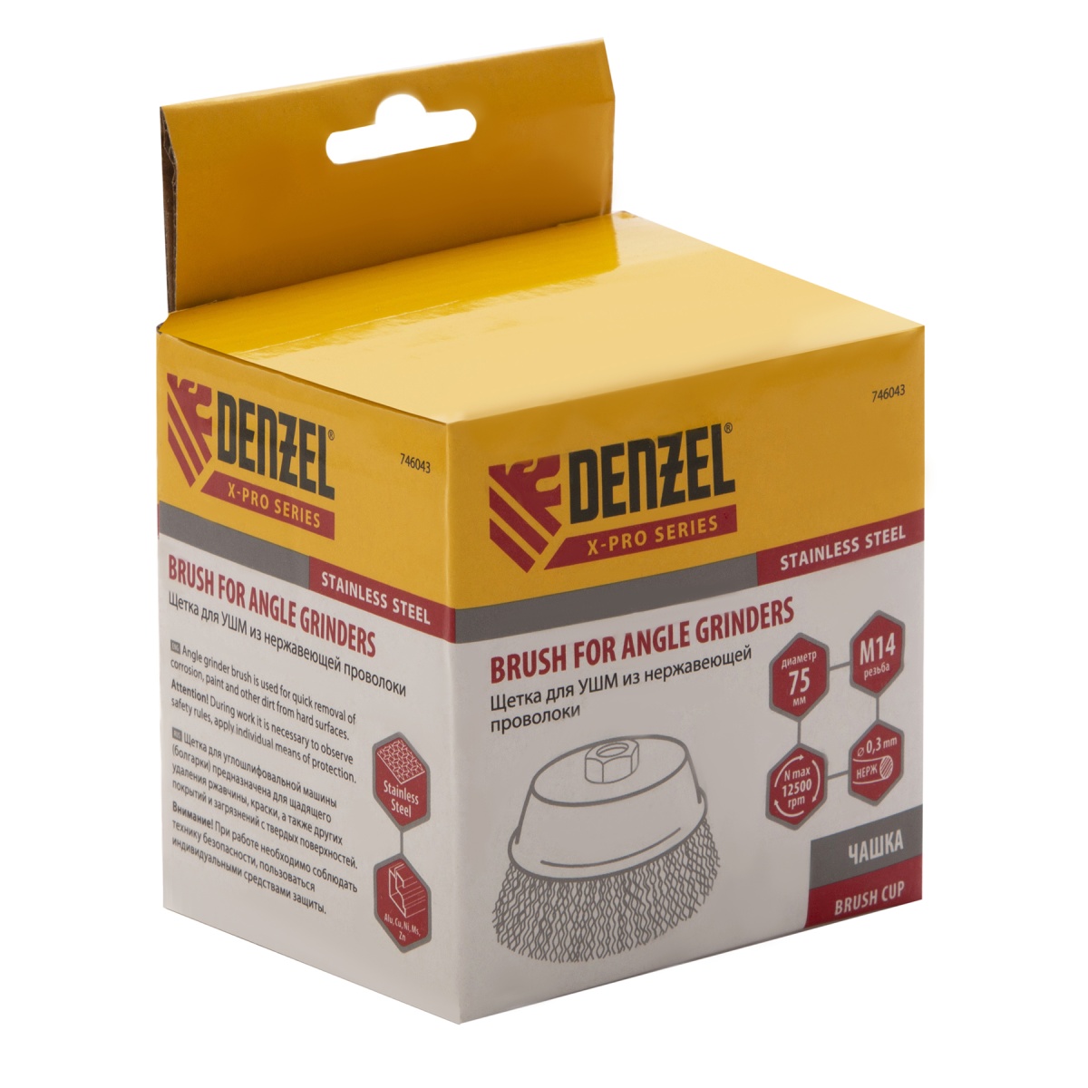 Щетка для УШМ, 75 мм, "Чашка", витая нержавеющая проволока 0.3 мм, М14 Denzel