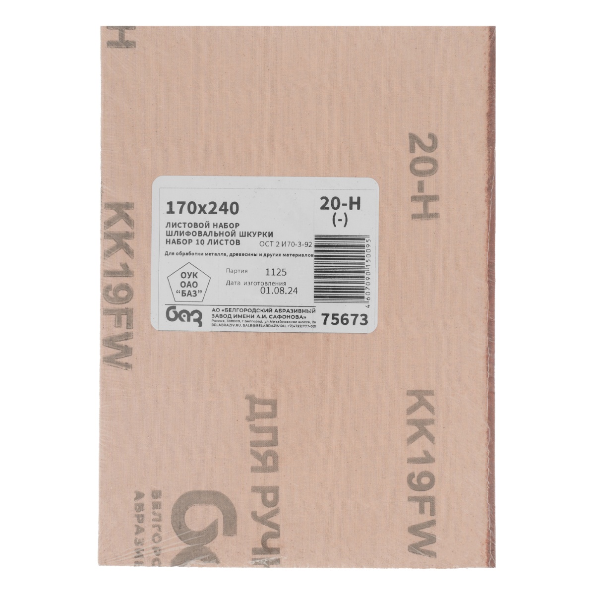 Шлифлист на тканевой основе, зернистость № 20, 240 х 170 мм, 10 шт, водостойкий, "БАЗ"