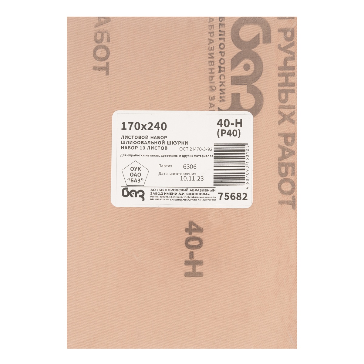 Шлифлист на тканевой основе, зернистость № 40, 240 х 170 мм, 10 шт, водостойкий, "БАЗ"