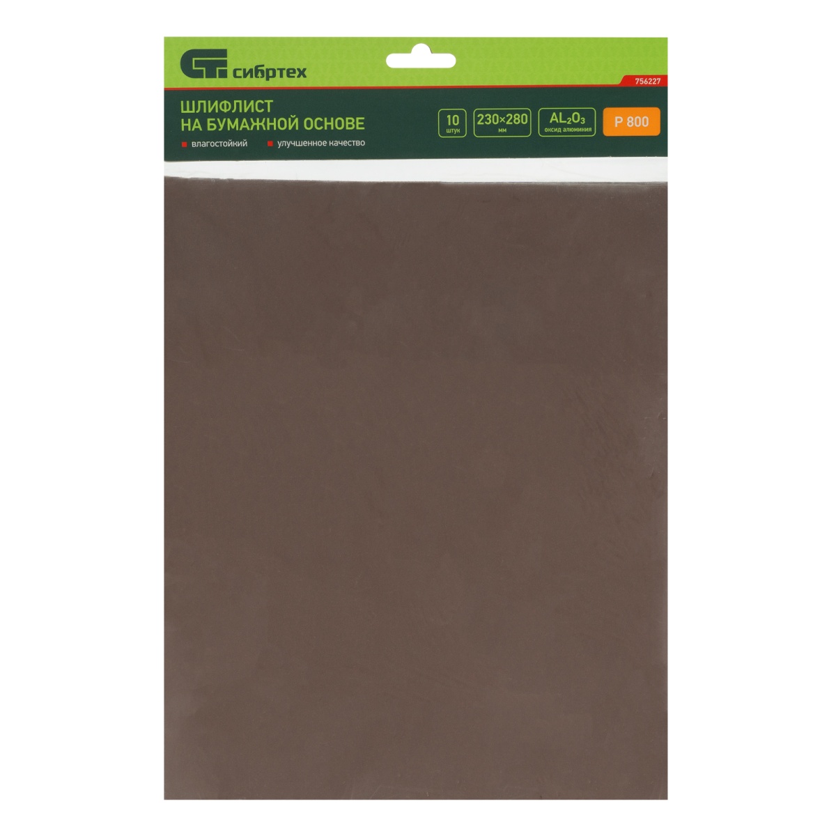 Шлифлист на бумажной основе, P 800, 230 х 280 мм, 10 шт, влагостойкий Сибртех