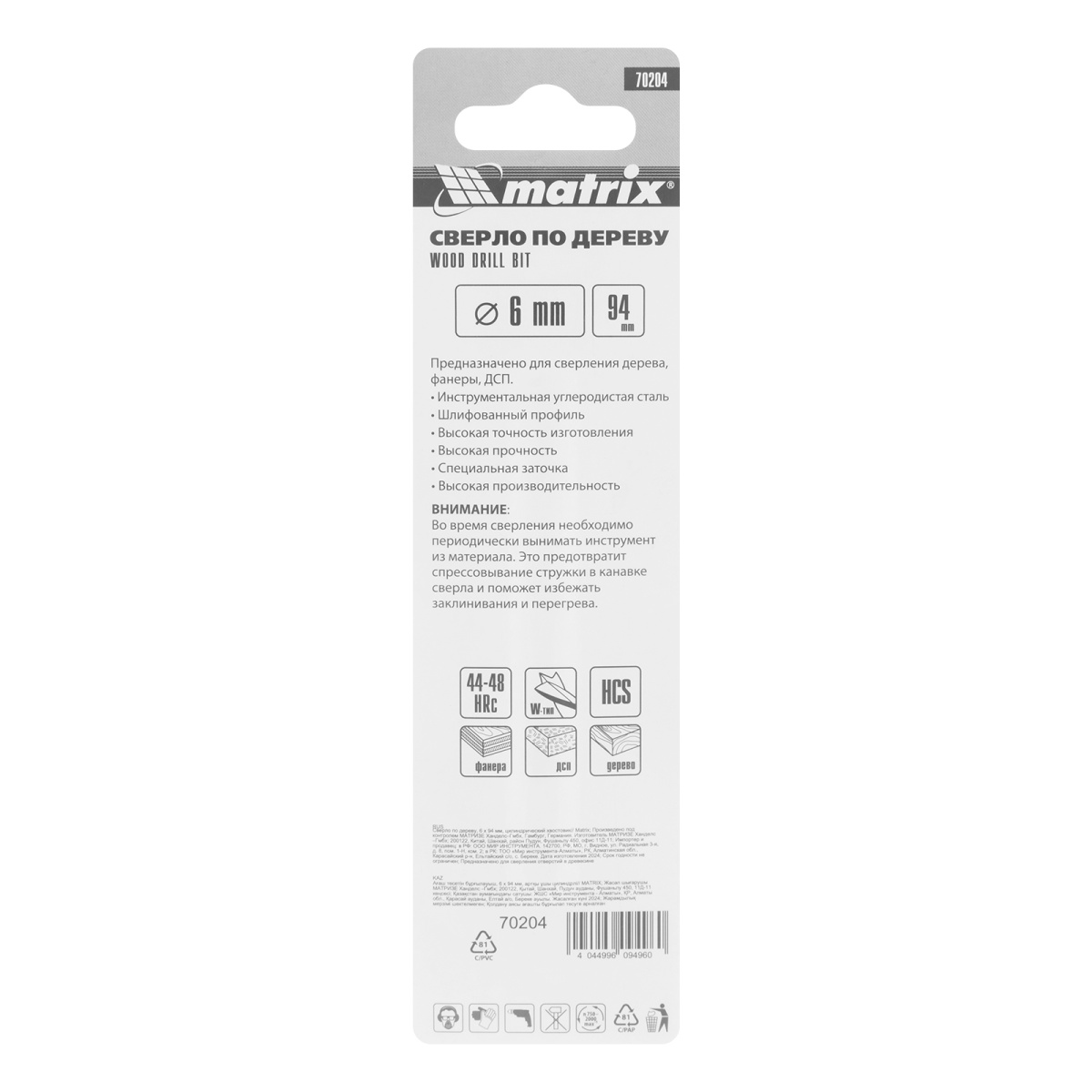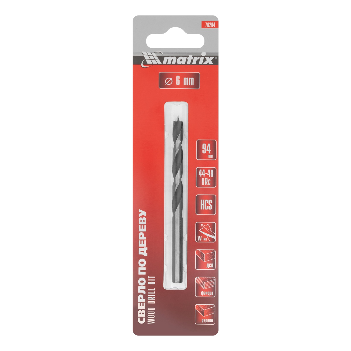 Наличие клапана для сброса давления Сверло по дереву, 6 x 94 мм, цилиндрический хвостовик Matrix