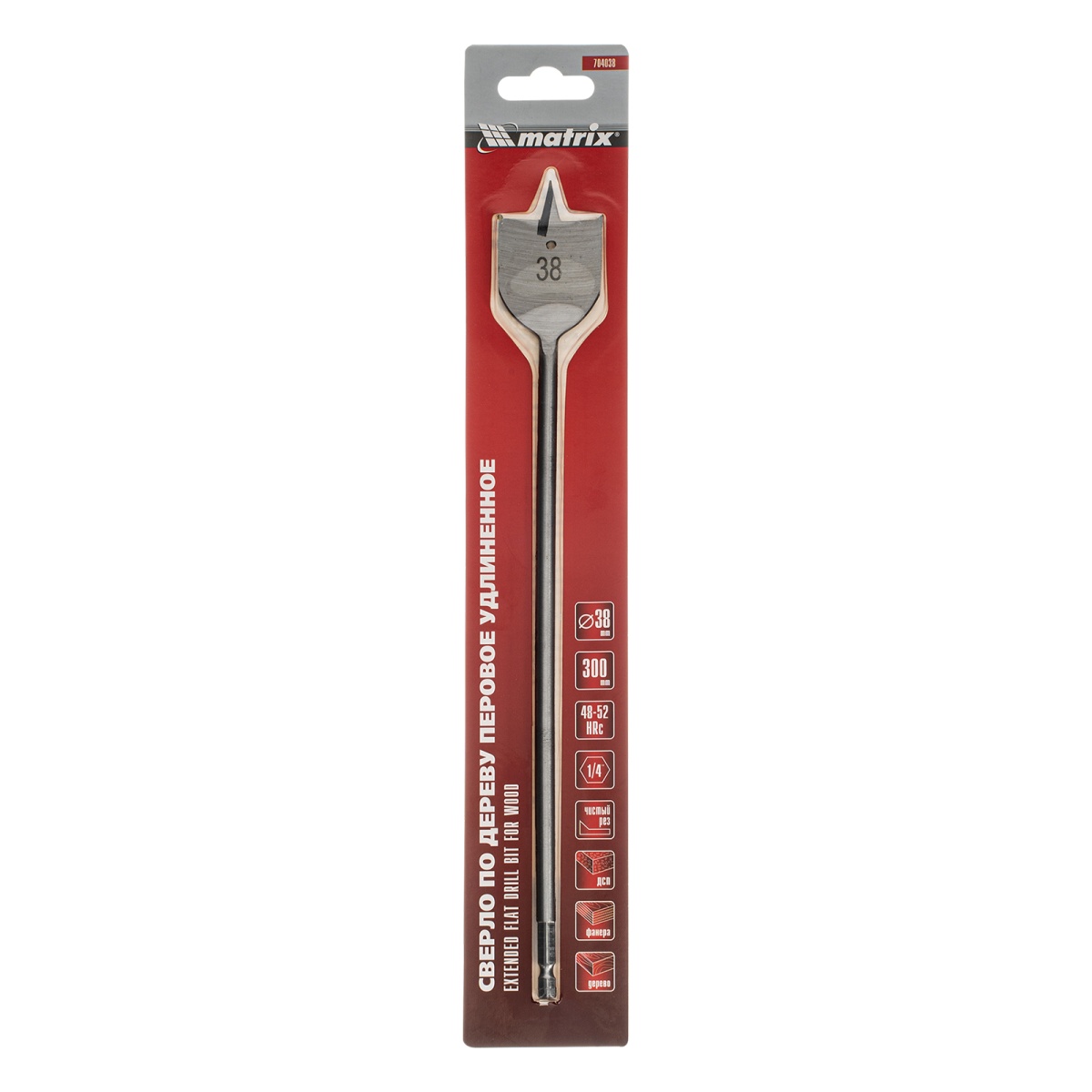 Сверло по дереву перовое удлиненное, 38 х 300 мм, шестигранный хвостовик Matrix